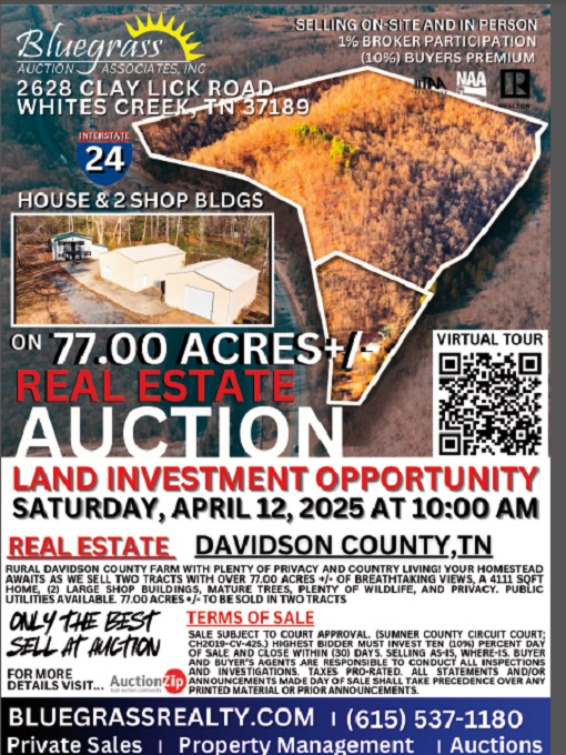 WHITES CREEK, TENNESSEE: (Smokey Barn News) – A remarkable property in Whites Creek, Tennessee is hitting the auction block. The property offers a unique opportunity for those seeking privacy, country living, and proximity to Nashville. The property, located at 2628 Claylick Road, sits on a 3.15-acre tract with an additional unimproved wooded parcel at 0 Claylick Road, bringing the total acreage to approximately 77 acres. LOCATION OF PROPERTY The spacious home, offering over 4,100 square feet of living space, is set to be auctioned live on-site Saturday, April 12th at 10:00 AM, with a 10% buyer’s premium added to the purchase price.