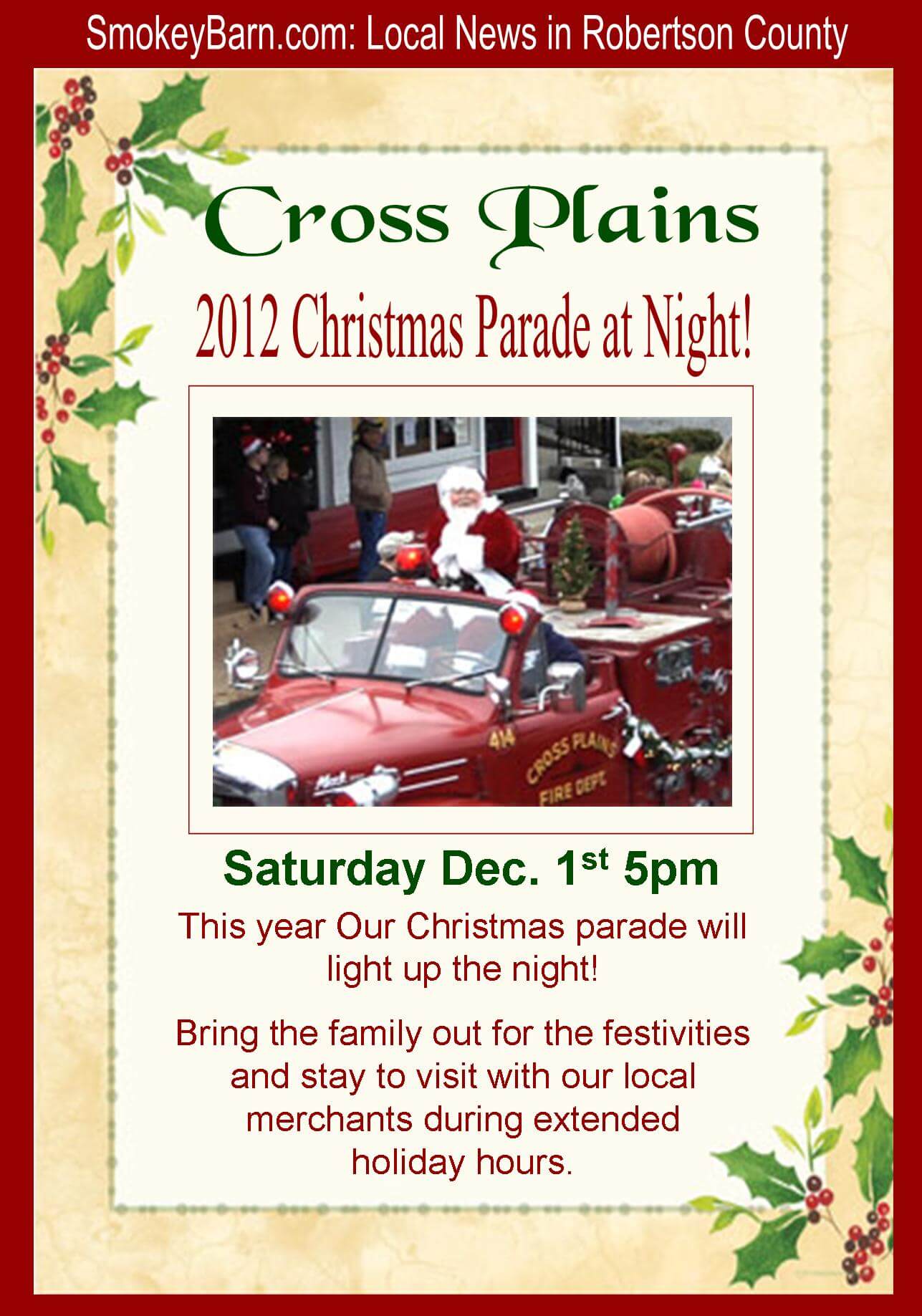 Announcement: Cross Plains Christmas Parade Dec. 1st December 1, 2012 UPDATE PARADE STARTS AT 6PM….. But come early and shop local merchants before the parade!…Cross Plains Christmas parade will light up the night! Saturday December 1st! Tweet