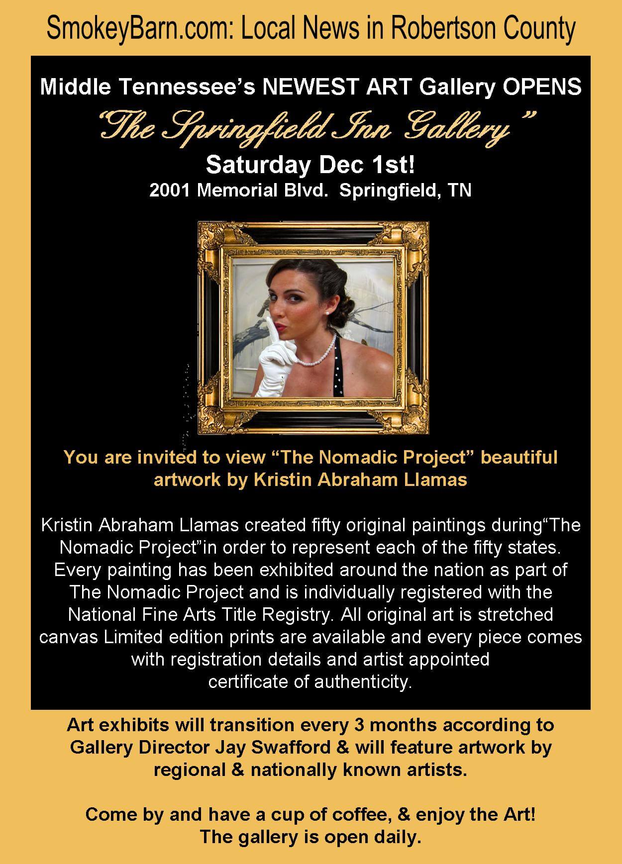 Middle Tennessee’s NEWEST ART Gallery OPENS “The Springfield Inn Gallery” Saturday Dec 1st! 2001 Memorial Blvd. Springfield, TN….You are invited to view “The Nomadic Project” beautiful artwork by Kristin Abraham Llamas…Kristin Abraham Llamas created fifty original paintings during“The Nomadic Project”in order to represent each of the fifty states. Every painting has been exhibited around the nation as part of The Nomadic Project and is individually registered with the National Fine Arts Title Registry. All original art is stretched canvas Limited edition prints are available and every piece comes with registration details and artist appointed certificate of authenticity.