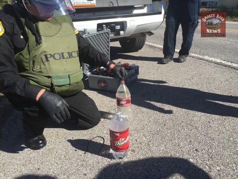 A video-scope equipped with a digital light was brought to the scene. Wearing a special protective vest and a ballistic helmet, the B.A.O. used the special camera to look inside the box. The camera revealed that the box contained two plastic bottles containing some kind of clear liquid. The two bottles in the big box seemed suspicious to the B.A.O. so they were carefully examined. “There were no visible wires, trigger or power source visible inside the box but the camera offers a limited view,” Douglas said.