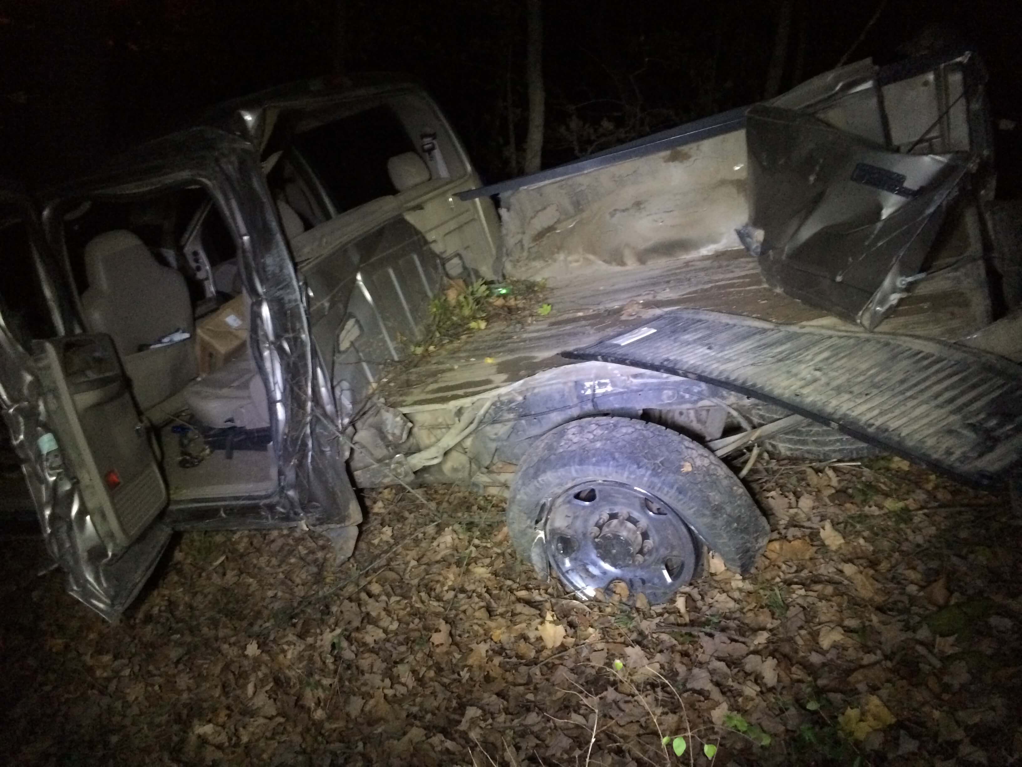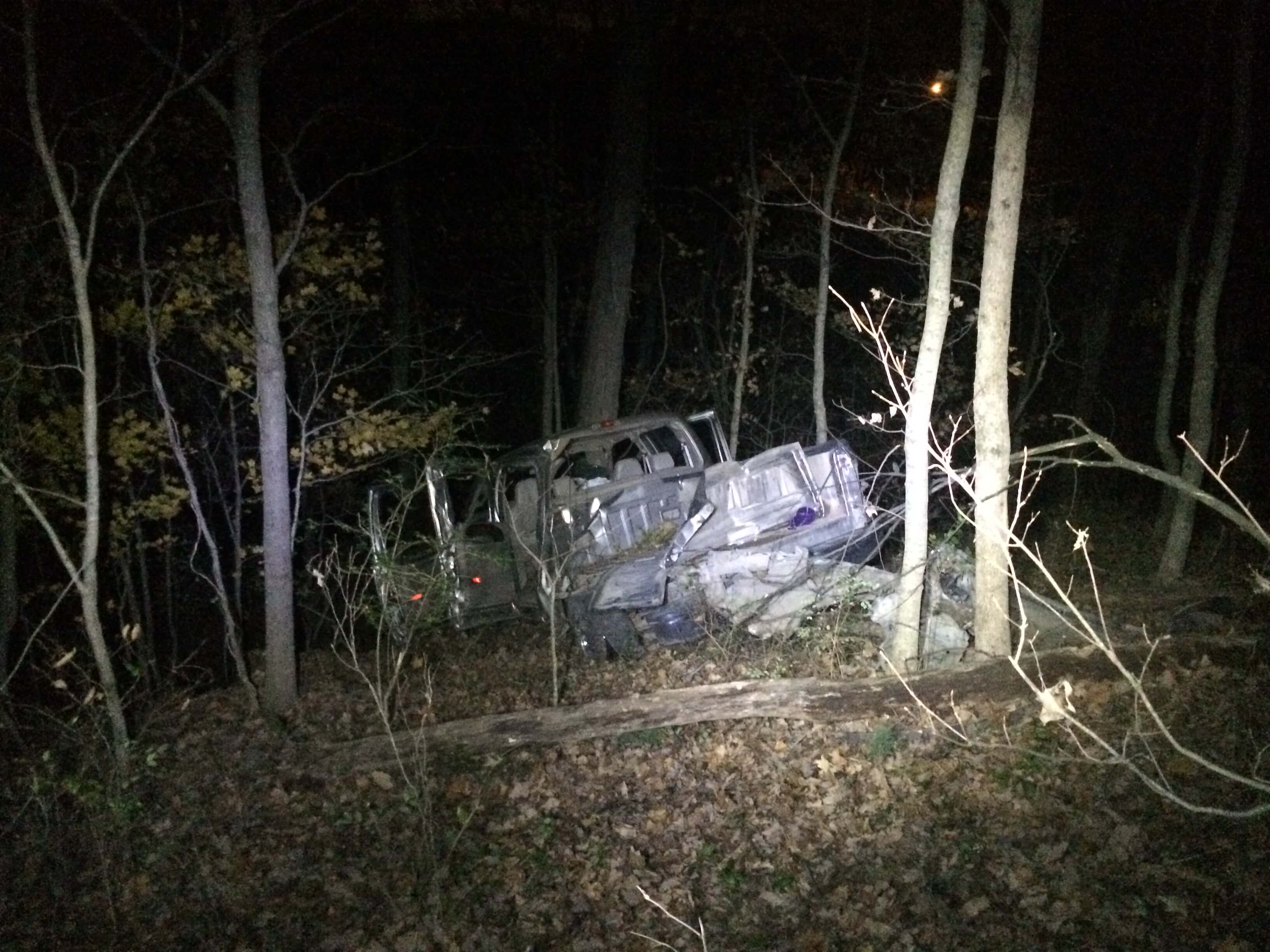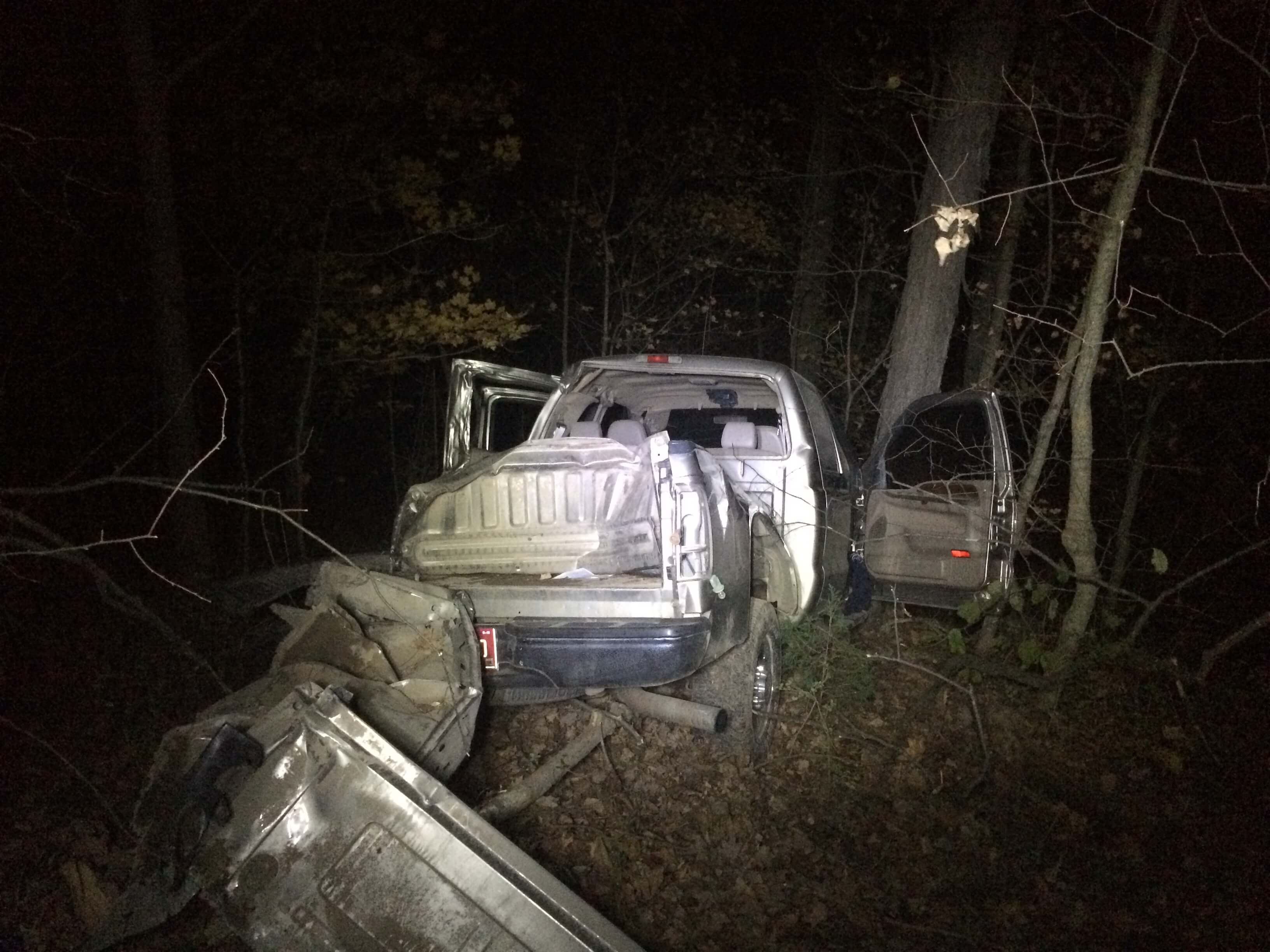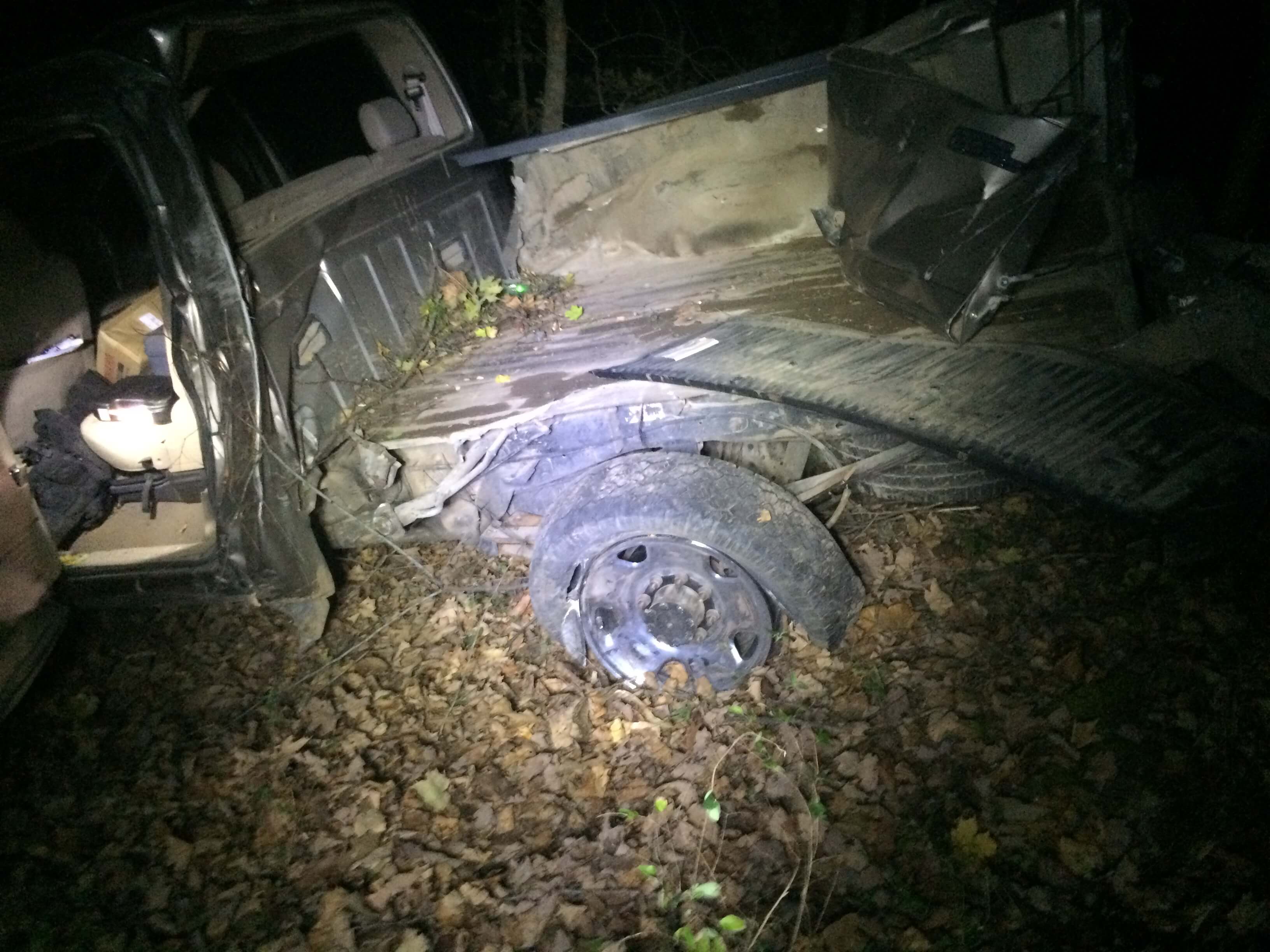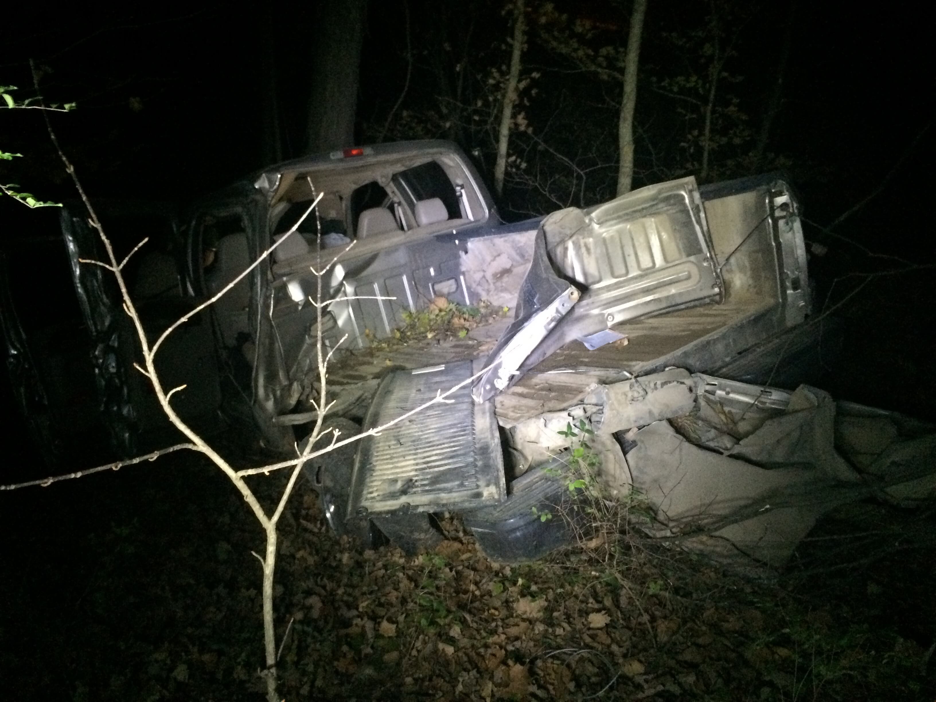 According to Cooper, after impacting the utility pole, the truck traveled another 80 to 100 feet along the side of the road tossing a sink and a stove from the bed of the truck along the way. The truck then veered sharply left into a thickly wooded area and down a steep embankment. The truck was tossed left and right ricocheting off trees as it sailed down the embankment towards Millers Creek.