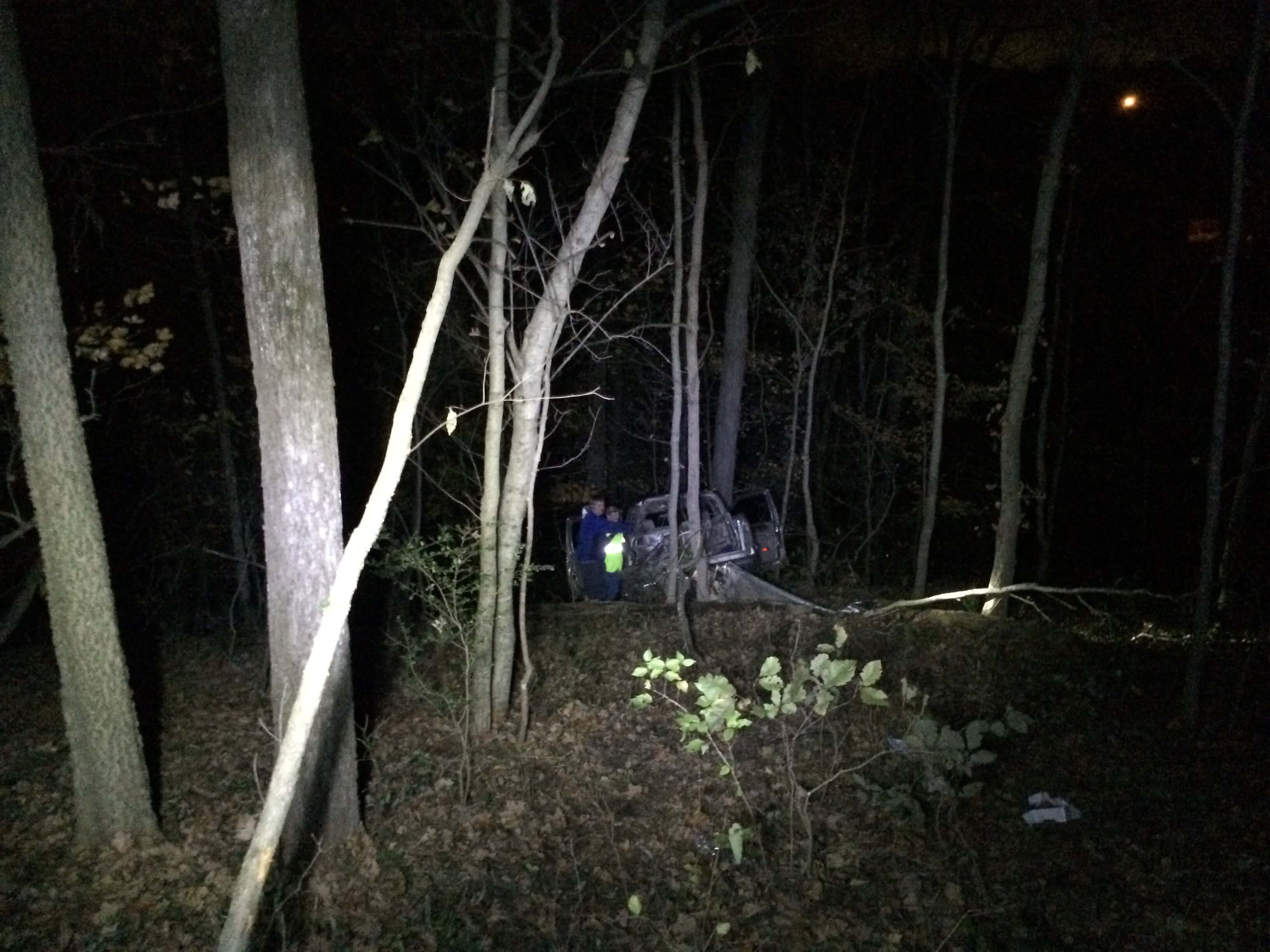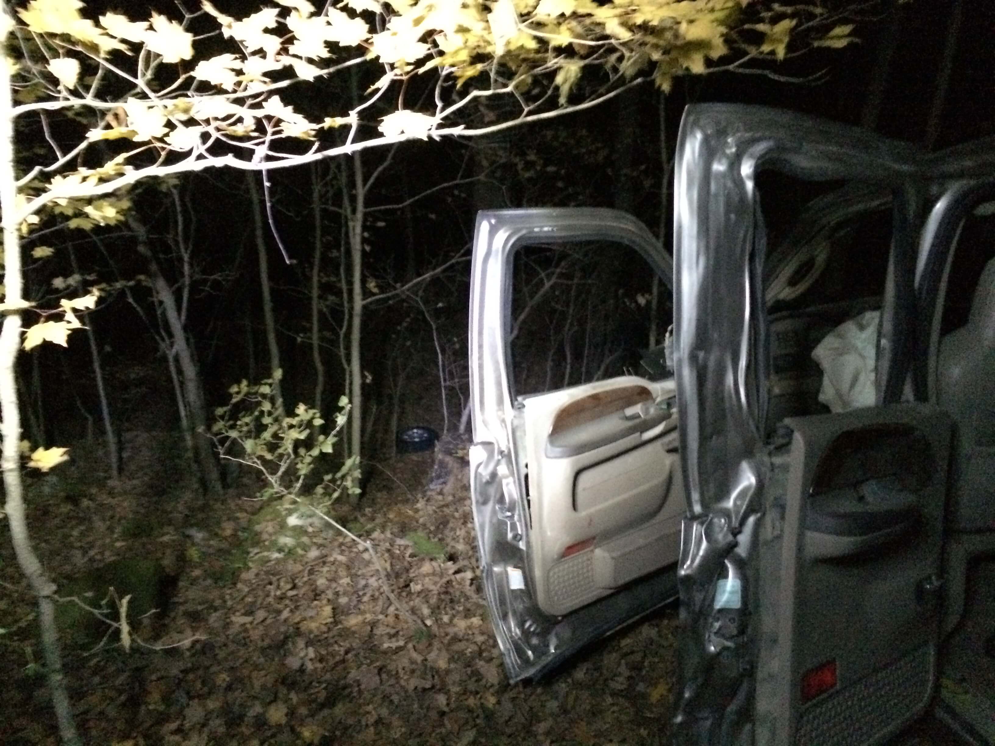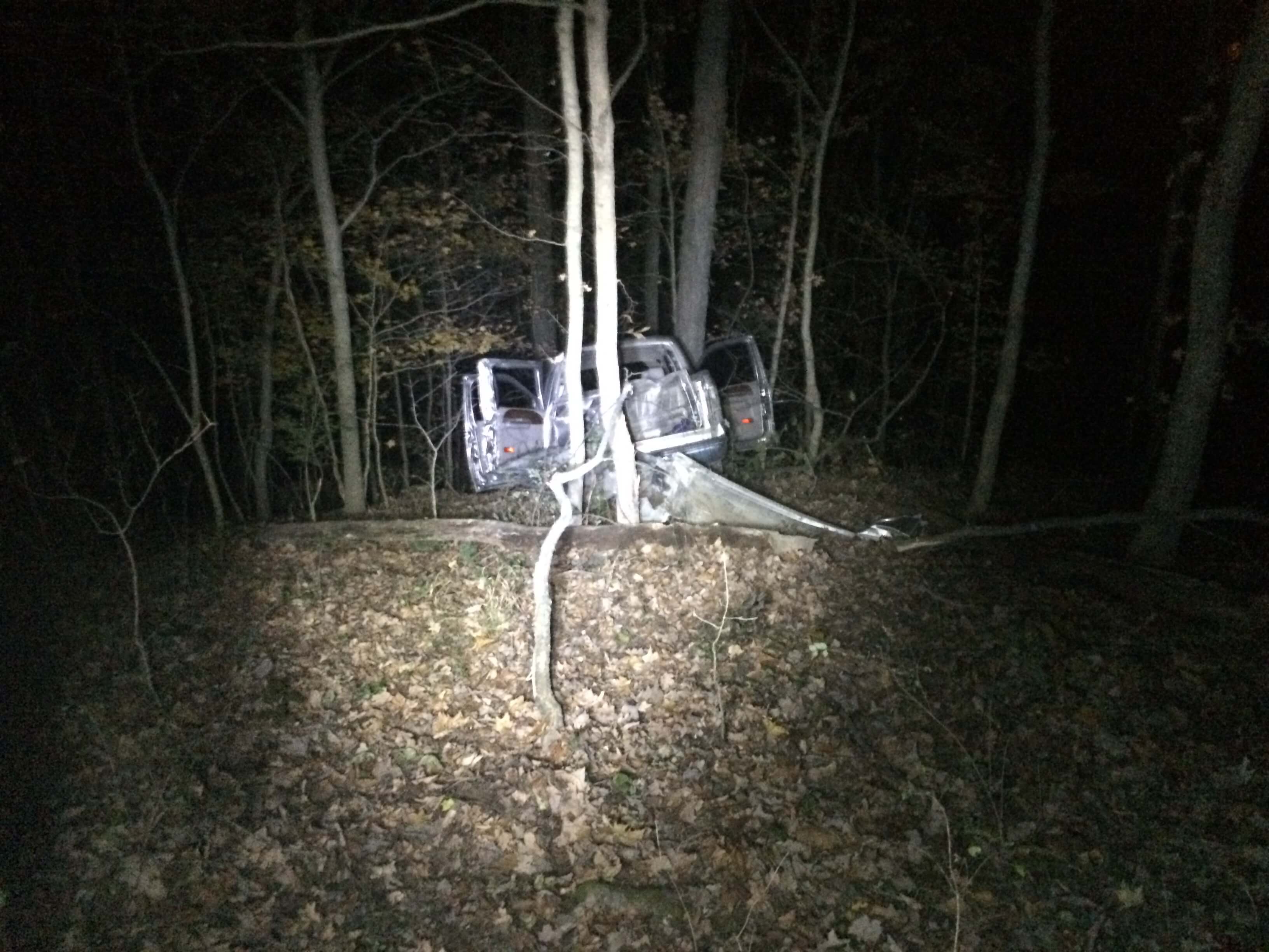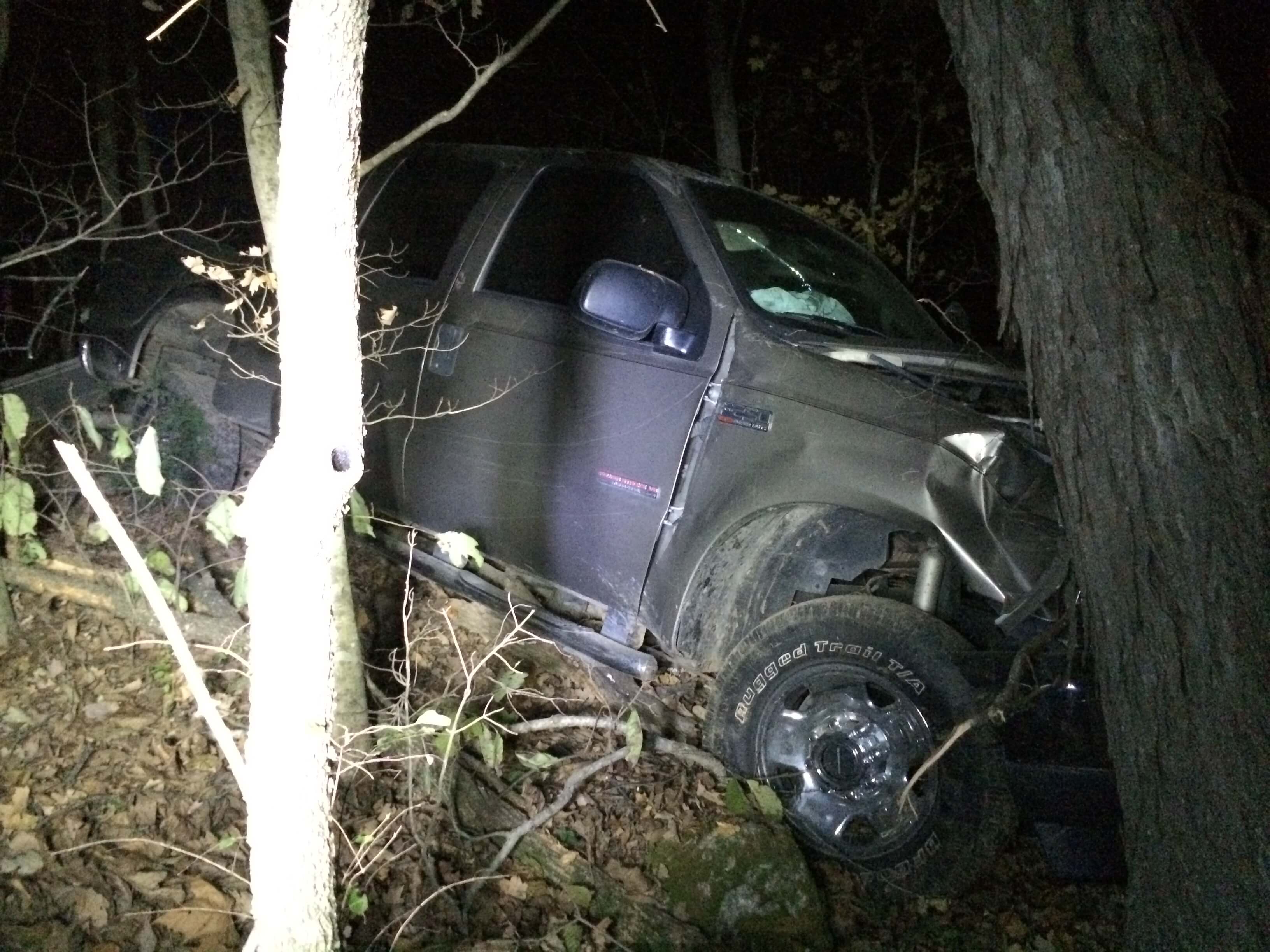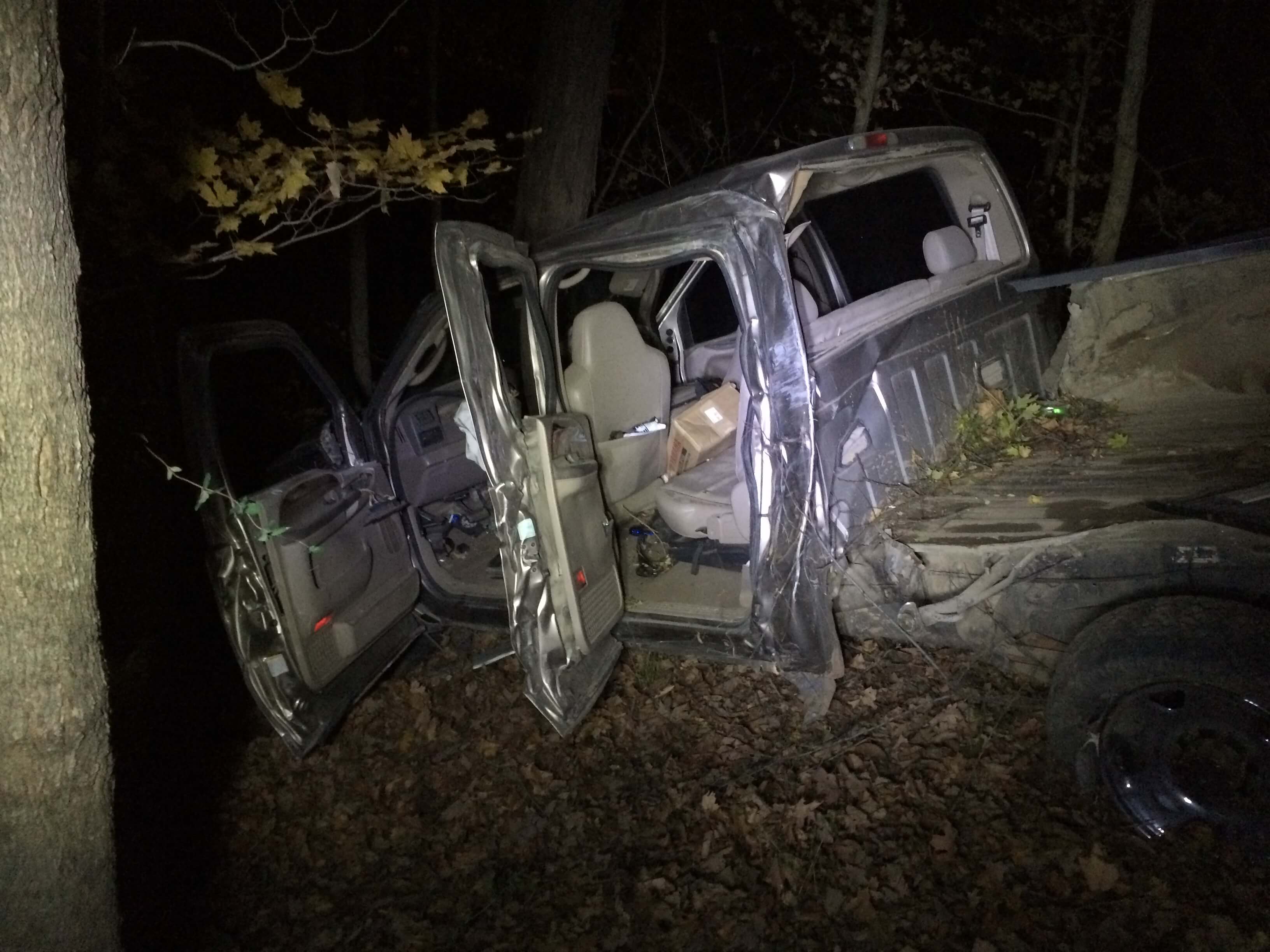 According to Cooper, after impacting the utility pole, the truck traveled another 80 to 100 feet along the side of the road tossing a sink and a stove from the bed of the truck along the way. The truck then veered sharply left into a thickly wooded area and down a steep embankment. The truck was tossed left and right ricocheting off trees as it sailed down the embankment towards Millers Creek.