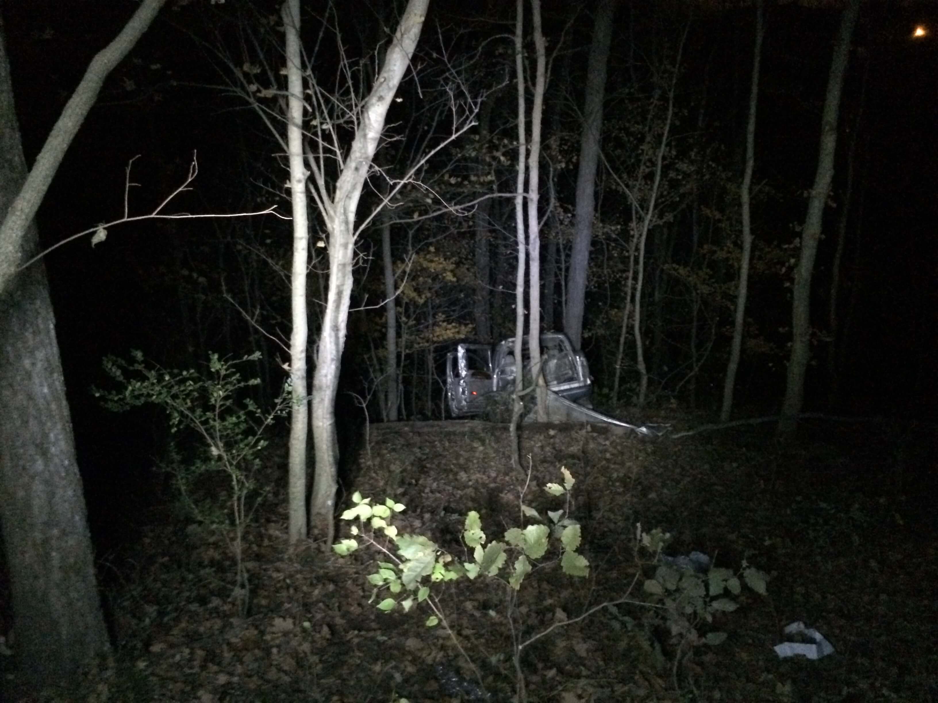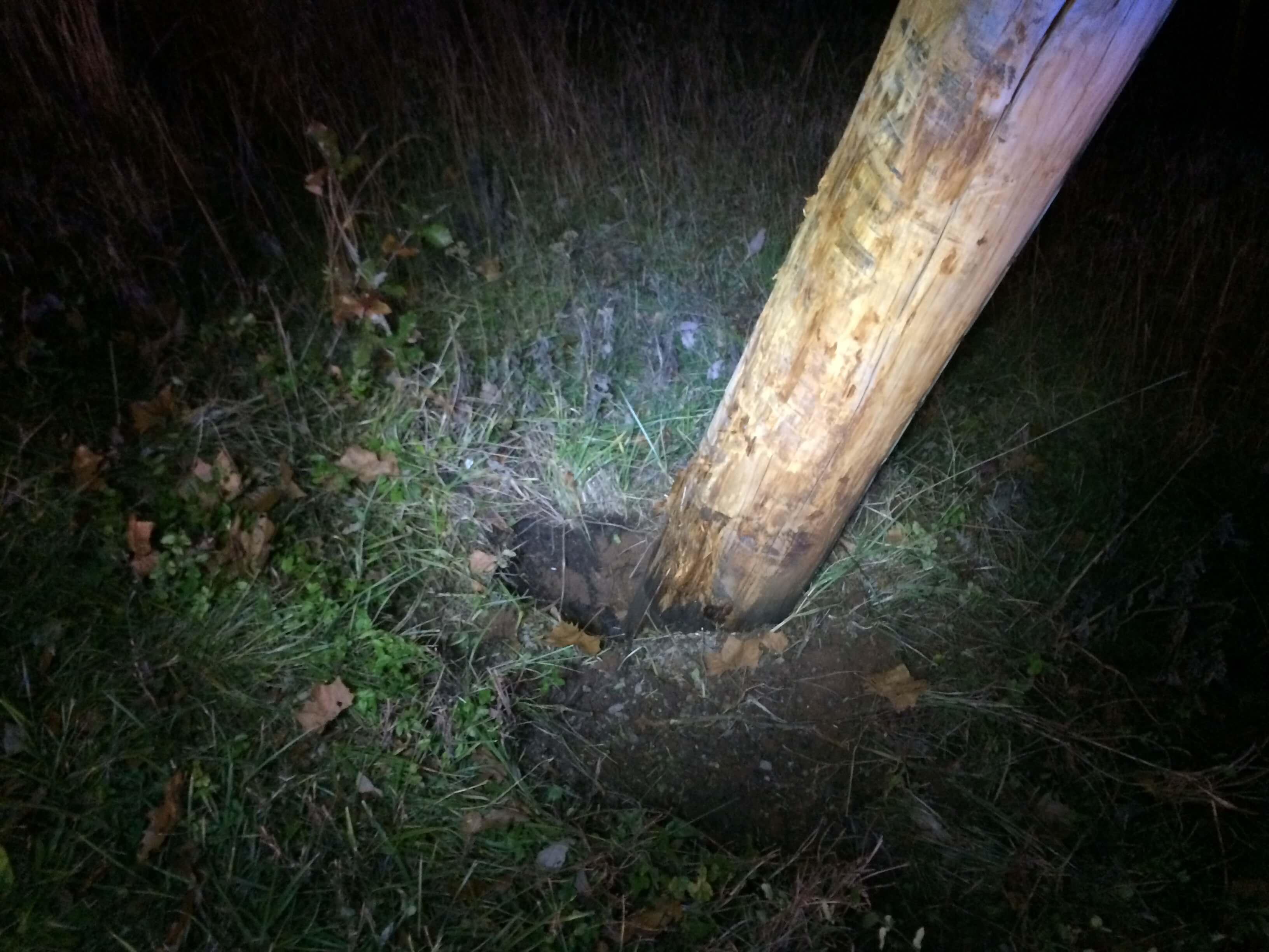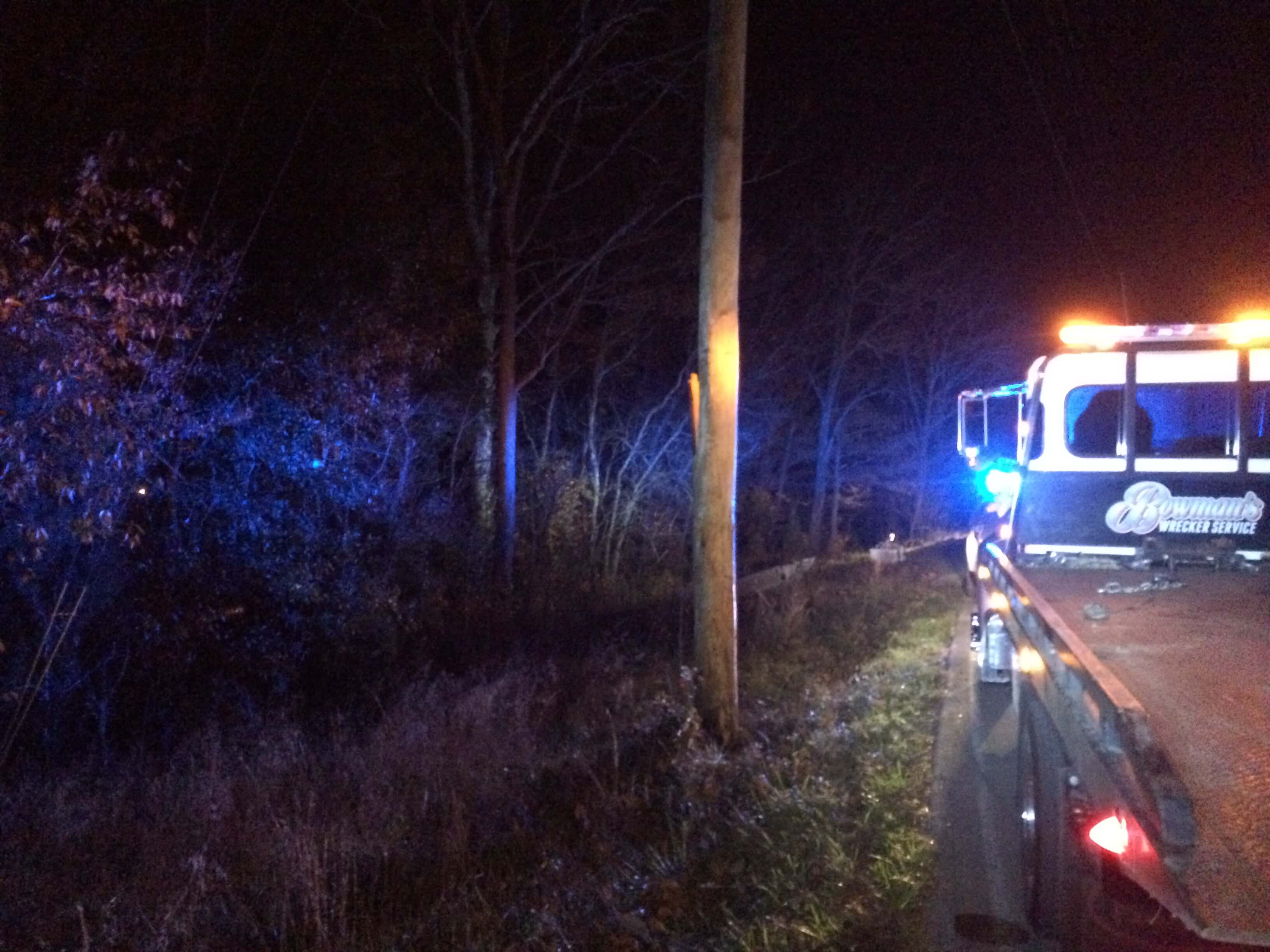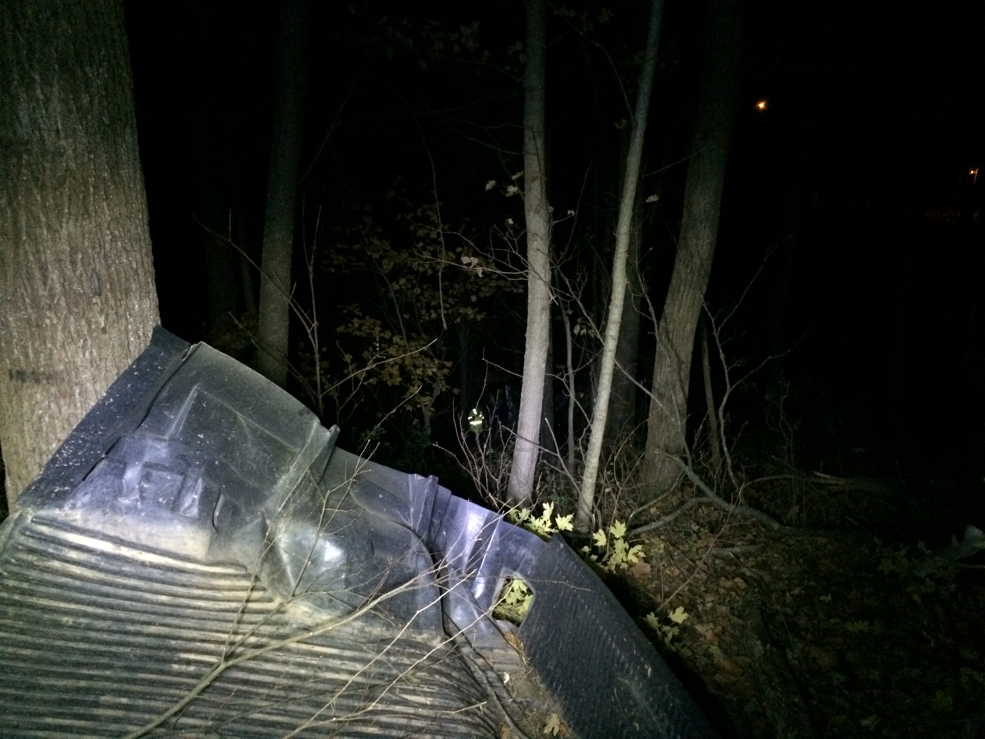 For reasons unknown at this time, the driver lost control of the vehicle, struck a utility pole and then careened about 100 feet down a steep embankment. The utility pole snapped in half with the force of the impact. (See photos below)