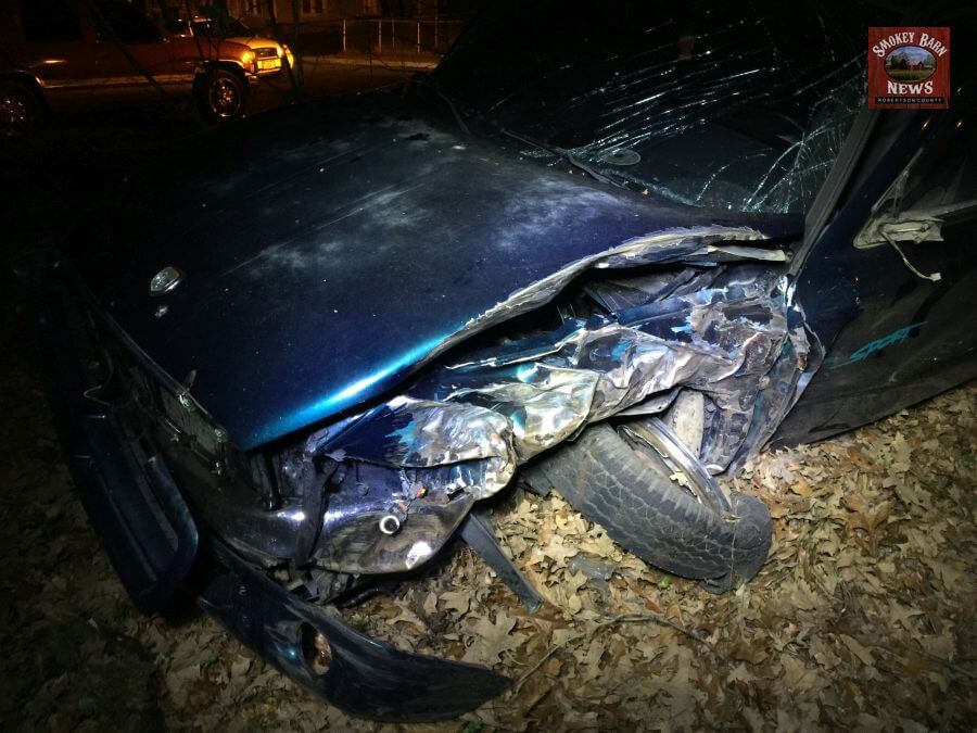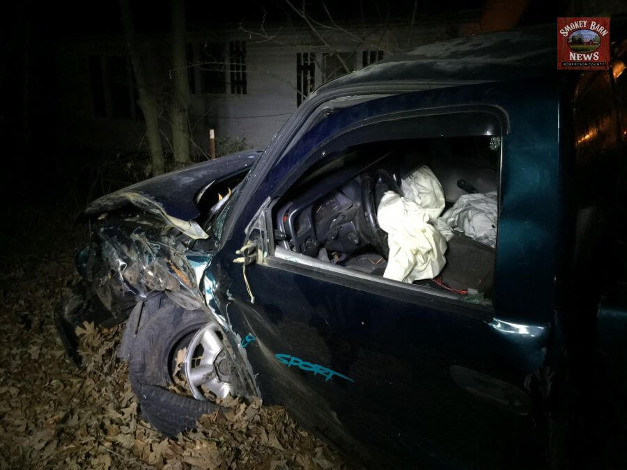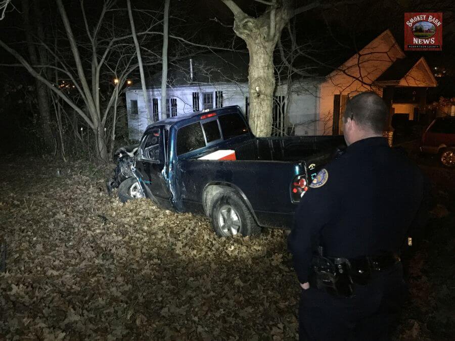 SPRINGFIELD TENNESSEE: (Smokey Barn News) – A pickup truck crashed into a large tree nearly ripping off the driver side fender and wheel. The crippled vehicle continued another 100 feet before sliding to a stop just feet from a home.