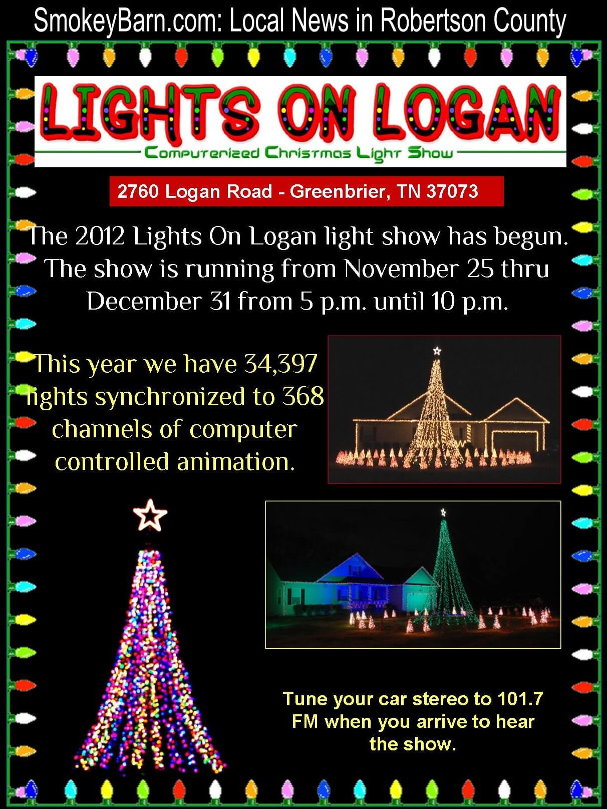 Lights On Logan! 2760 Logan Rd in Greenbrier, TN. The 2012 Lights On Logan light show has begun. This year we have 34,397 lights synchronized to 368 channels of computer controlled animation. The show is running from November 25 thru December 31 from 5 p.m. until 10 p.m.The light show runs every 20 minutes from 5:00 p.m. until 10:00 p.m.