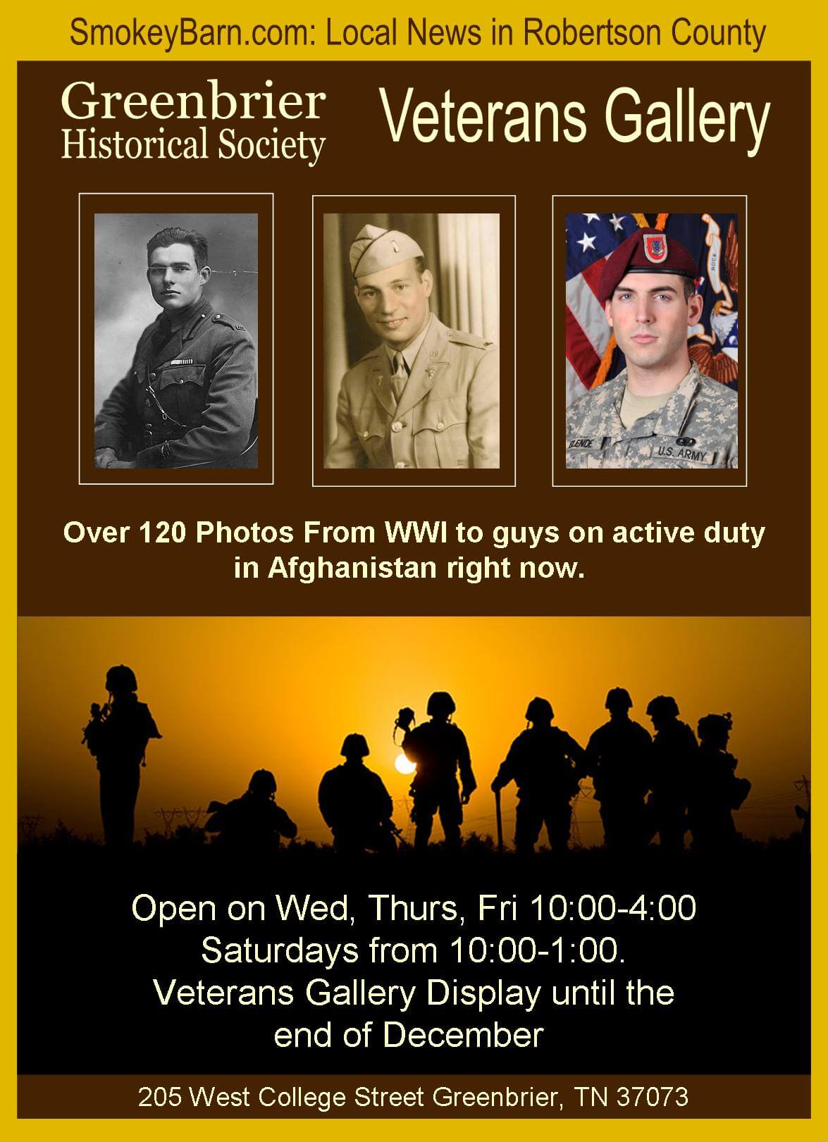 The Greenbrier Historical Society Museum/Library presents a Veterans Gallery. Come and see over 120 photos of Veterans of our area. They range from WWI to guys on active duty in Afghanistan right now. Hours are Wed, Thurs, Fri –10:00-4:00 and on Saturdays from 10:00-1:00. The Gallery will be on display until the end of December.