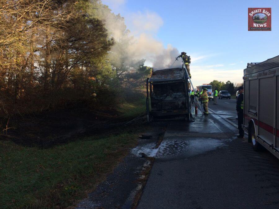 Jon Graves of Goodlettsville was heading North on I-65 on his way to work at Tate fabricating in White House and was able to snap a few photos. Graves’s was passing shortly after the fire started, as you can see, firefighters were not on the scene. One of Graves’ photos (left) shows that the fire started at the front of the truck. You can see more photos taken by Graves in the album below.