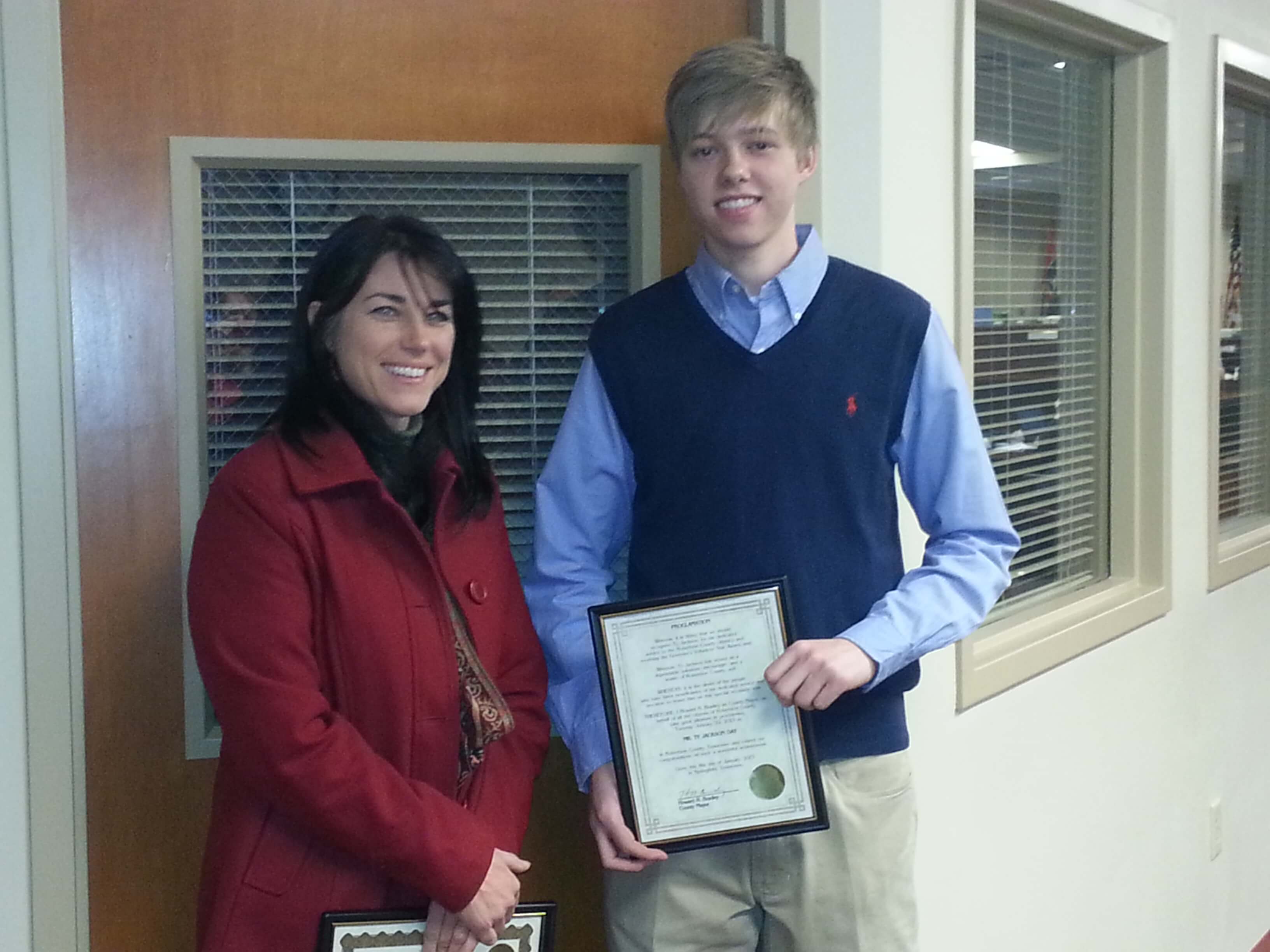 Ty Jackson & Beth Stodghill receive the Governor’s Volunteer Star Award for their dedicated service to the Robertson County citizen’s. Ty Jackson & Beth Stodghill have served as a dependable volunteers, encouragers and leaders of Robertson County through various organizations like CASA, Nursing Homes, the Backpack program and many more. To honor them on this special occasion County Mayor Howard R. Bradley proclaims Tuesday, January 29, 2013 as MR. TY JACKSON & MRS. BETH STODGHILL DAY in Robertson County, Tennessee. The mayor and the people of Robertson County would like to extend congratulations to them on such a wonderful achievement.