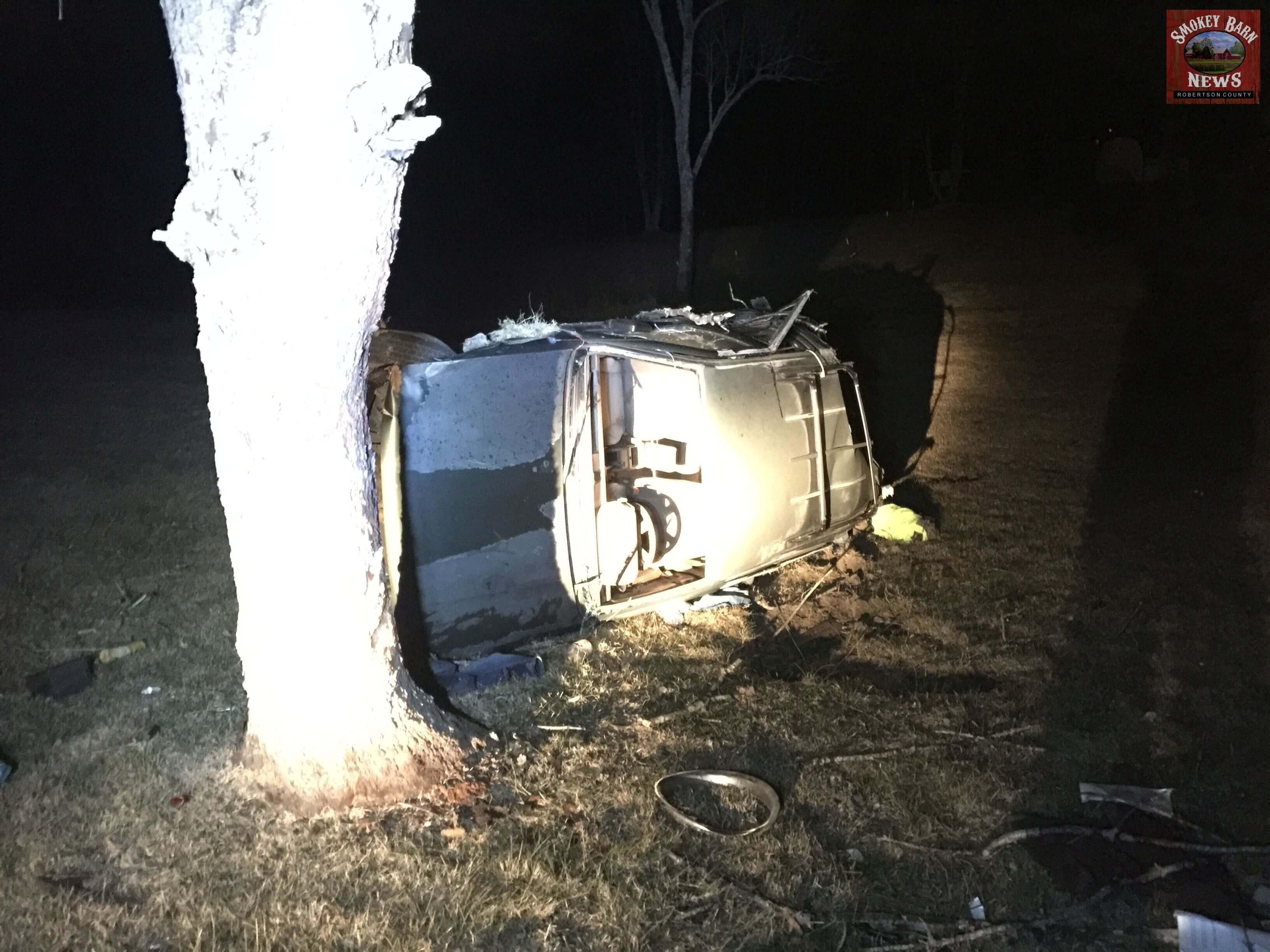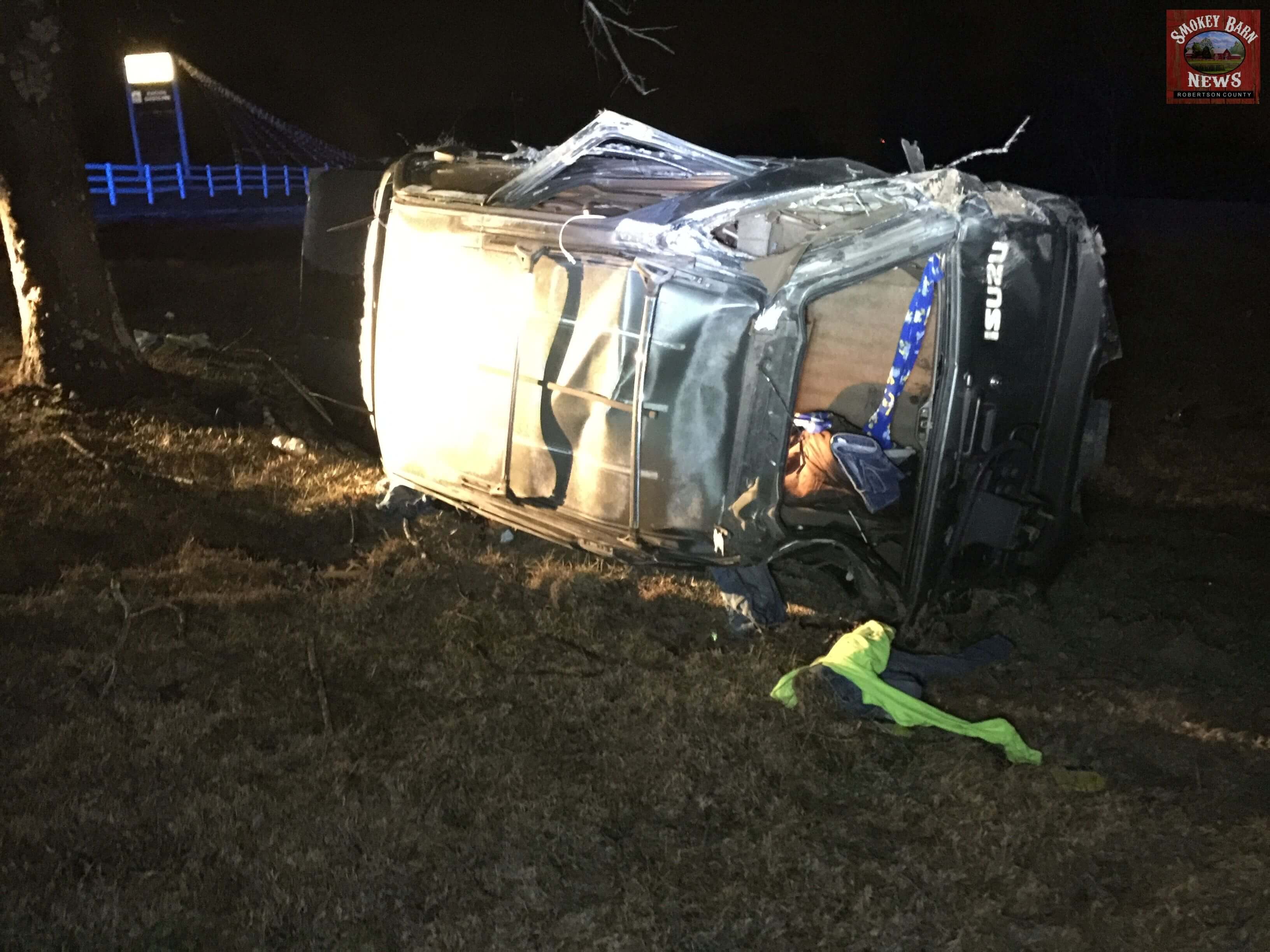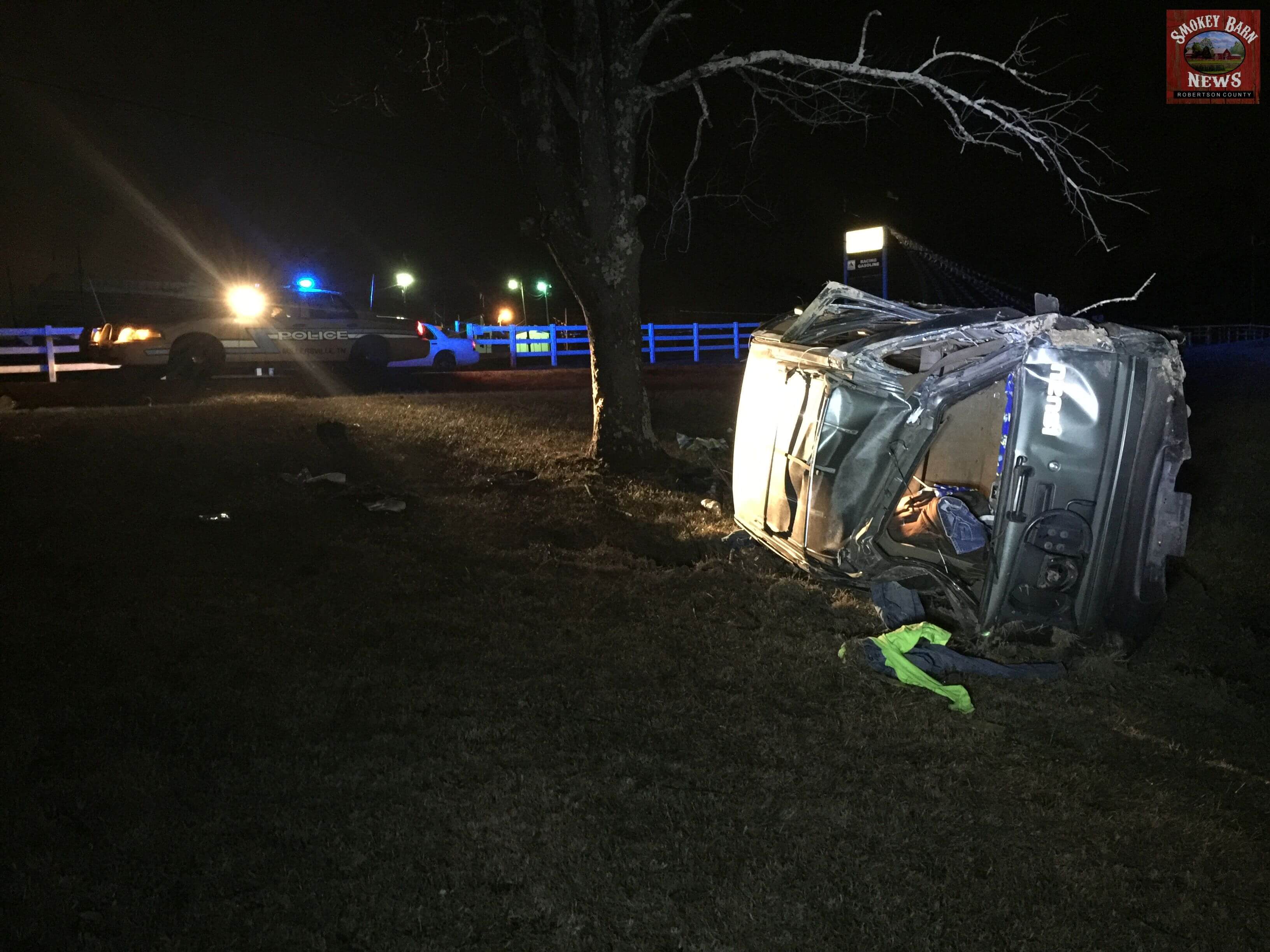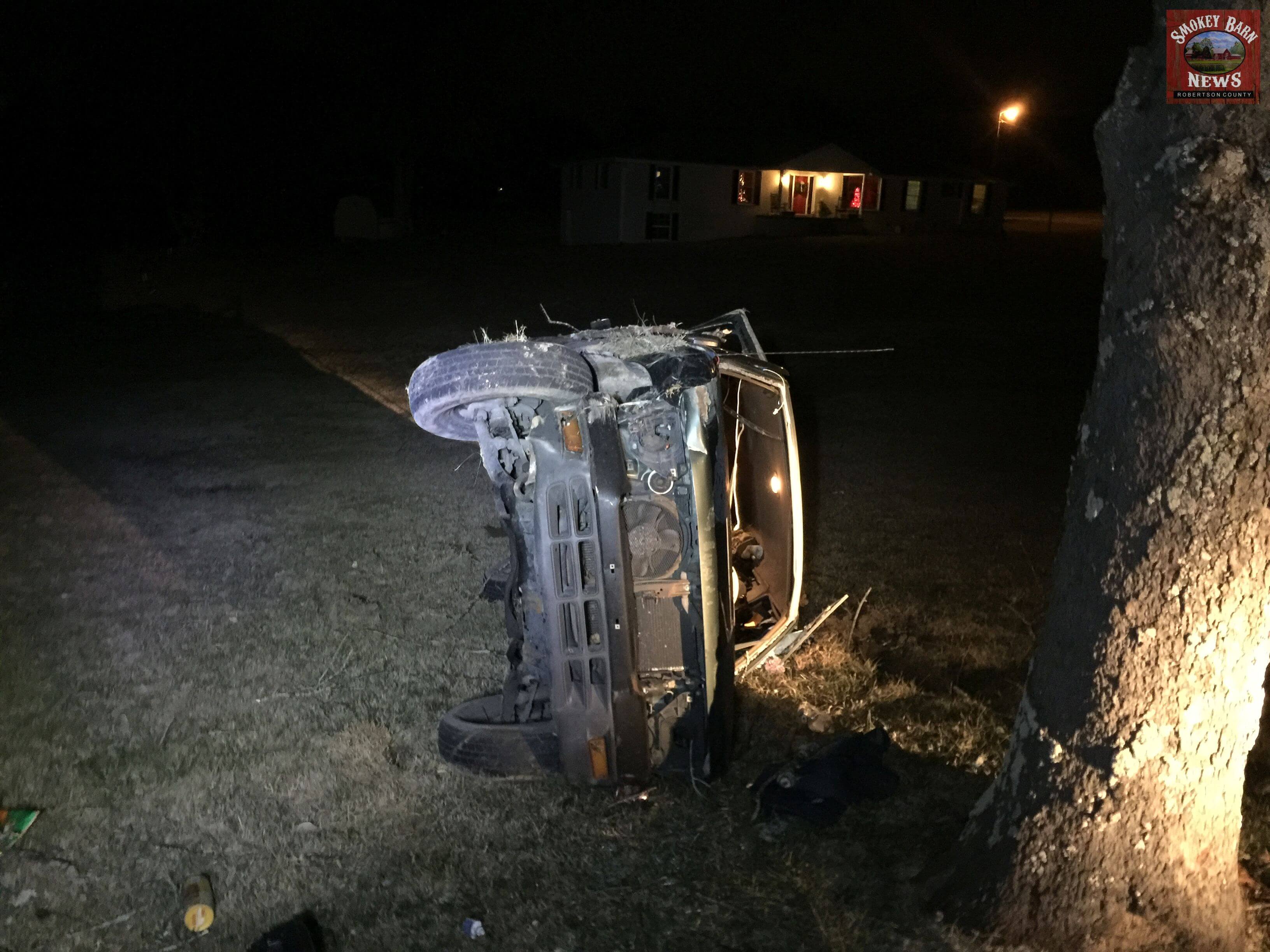 SPRINGFIELD TENNESSEE: (Smokey Barn News) – A Greenbrier man is lucky to be alive this evening after he lost control of his vehicle, left the roadway and crashed directly across from Highland Rim Speedway. The accident occurred around 8:00pm Tuesday evening.