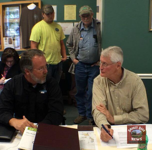 Mike Barnett (R) talks with Coopertown Mayor Sam Childs.