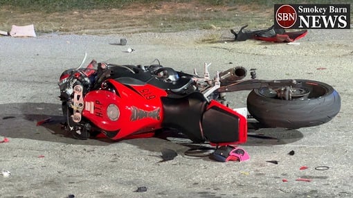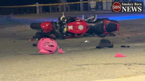 Security video from the One Stop Market on the corner, released to Smokey Barn News, shows the SUV running the stop sign and crashing into the motorcycle. Smokey Barn News has reviewed the video, and we have decided to roll the footage in our video report above; however, viewer discretion is strongly advised: the footage is graphic due to the mechanics of the crash.