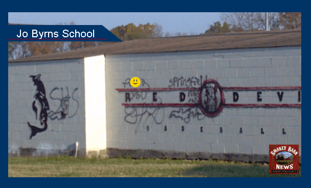 CEDAR HILL TENNESSEE: (Smokey Barn News) – Jo Byrns School located at 7025 Highway 41 N in Cedar Hill was vandalized with graffiti Friday Night between 12:00AM and 7:00AM Saturday morning.