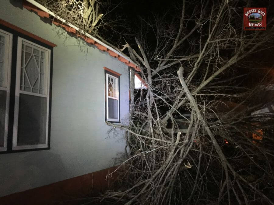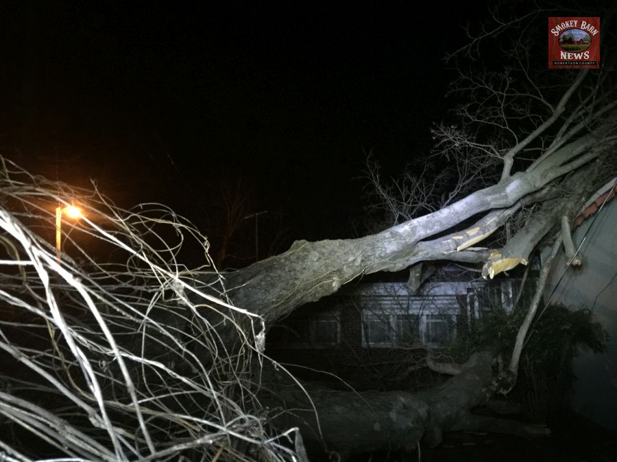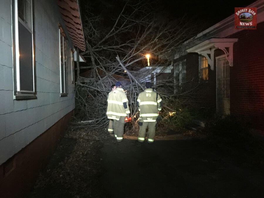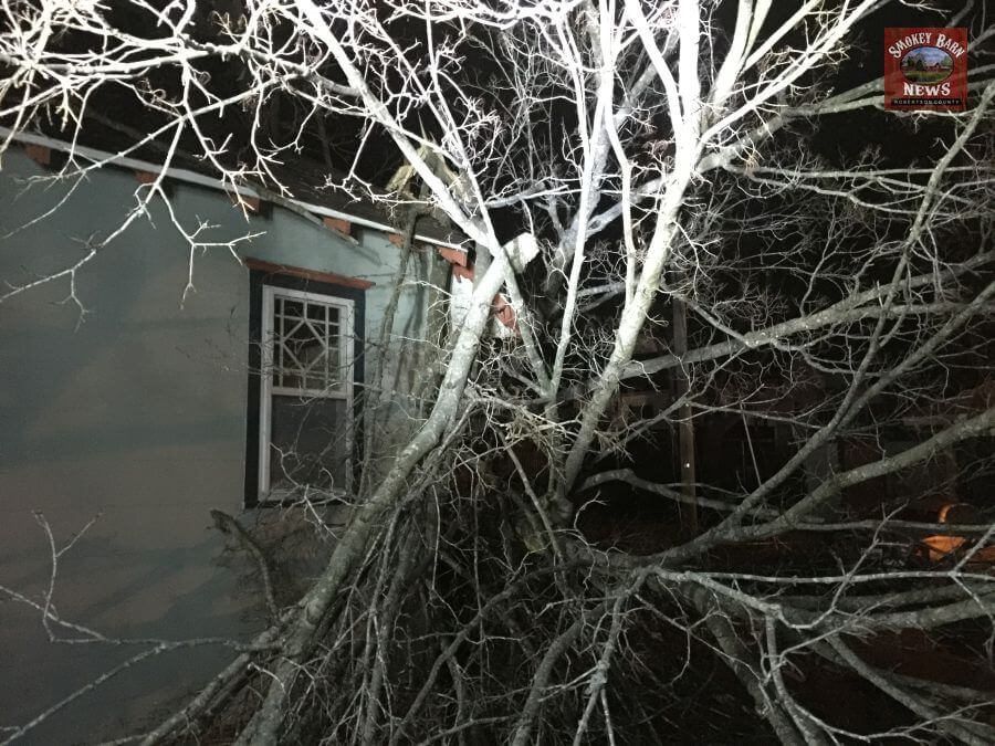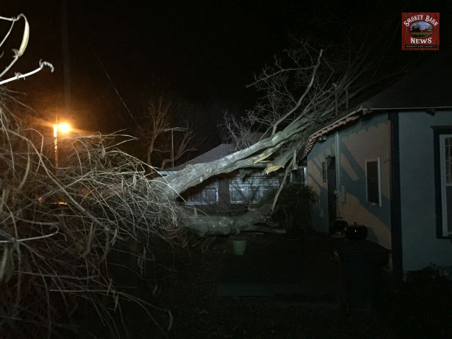 SPRINGFIELD TENNESSEE: (Smokey Barn News) – A Springfield woman will be staying in a hotel tonight after a large tree in her back yard succumbed to the high winds this evening and fell over crashing through her roof.
