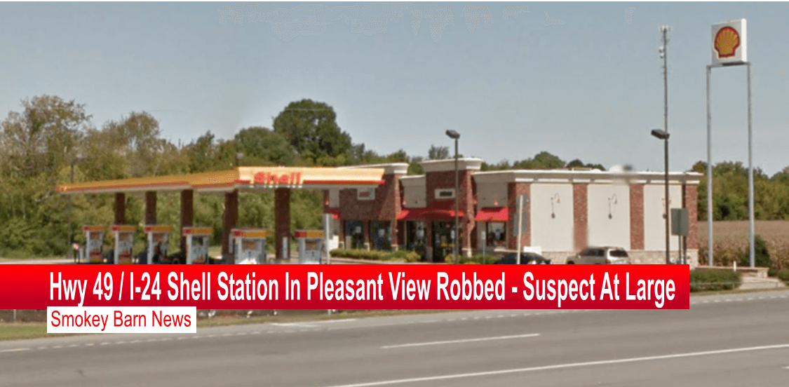 PLEASANT VIEW TENNESSEE: (Smokey Barn News) – The Shell/Sudden Service Store gas station located at 2605 Tennessee 49, Pleasant View, TN was robbed around 9:50PM Monday evening and the suspect is on the run. According to 911 dispatch the suspect is described as a black male, 6 feet tall wearing a three piece suit. The suspect vehicle is described as a two tone Chevy Impala. Police believe that this maybe the same suspect that robbed a Walmart earlier in the evening.