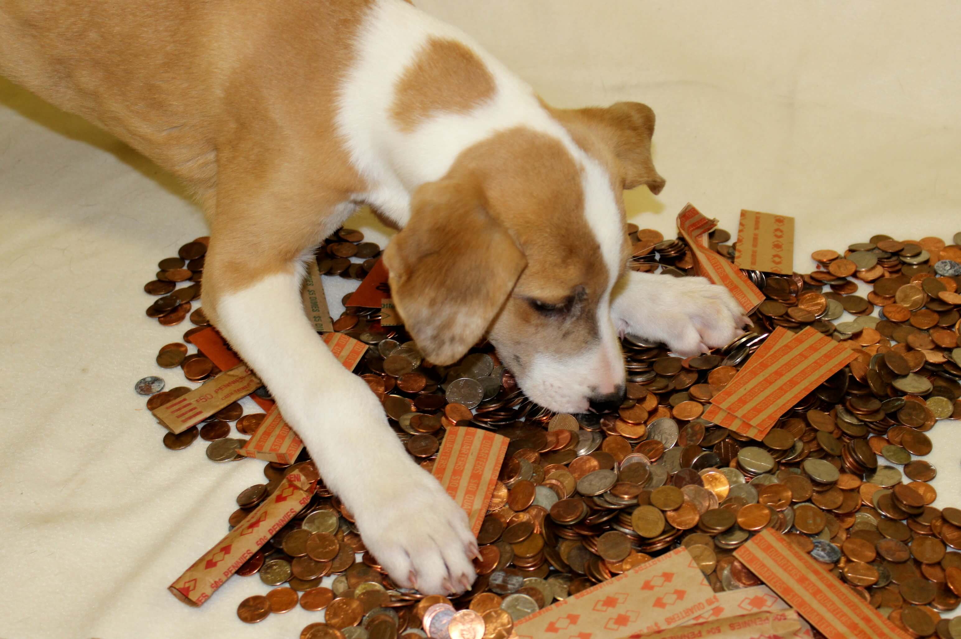 Sasha hurries through the many pennies and other coins to get her job done. She’s a young puppy who has lots of vim and vigor and wants to make sure the word gets out about the Pennies for Pets so maybe she can find a Forever Home and help save pennies, too.