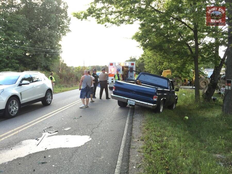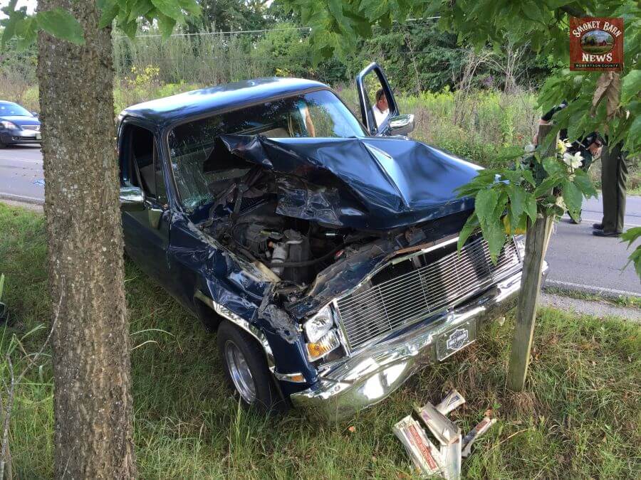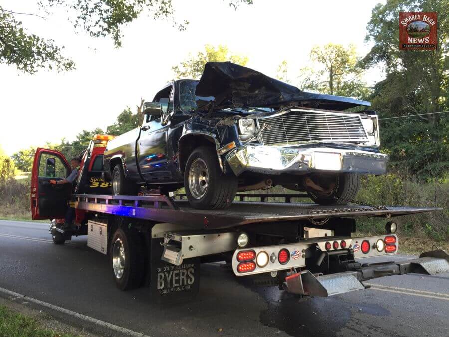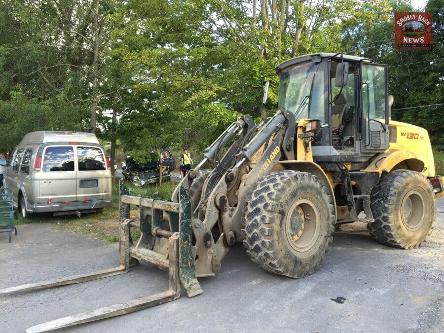 The driver of the forklift said he hardly felt the impact that left the pickup truck with heavy damage. The forklift driver told Smokey Barn News that he was feet from his own driveway when the Pickup rear-ended him.