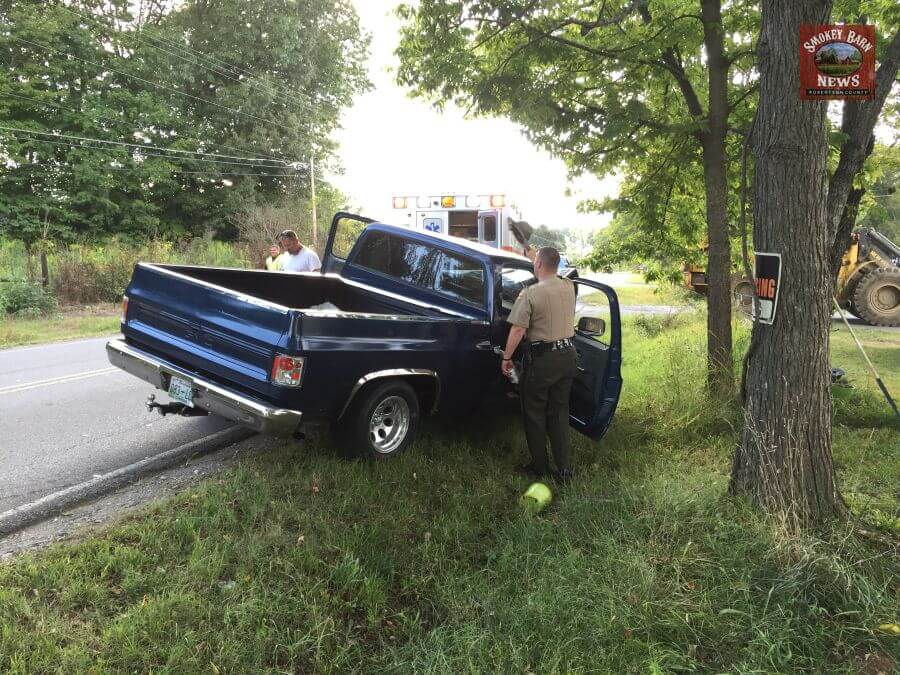 SPRINGFIELD TENNESSEE: (Smokey Barn News) – A pickup truck crashed into the back of a large industrial sized articulating wheel loader (Fork-Lift) Wednesday and the 38 year old driver from Cedar Hill managed to walk away with only minor injuries.