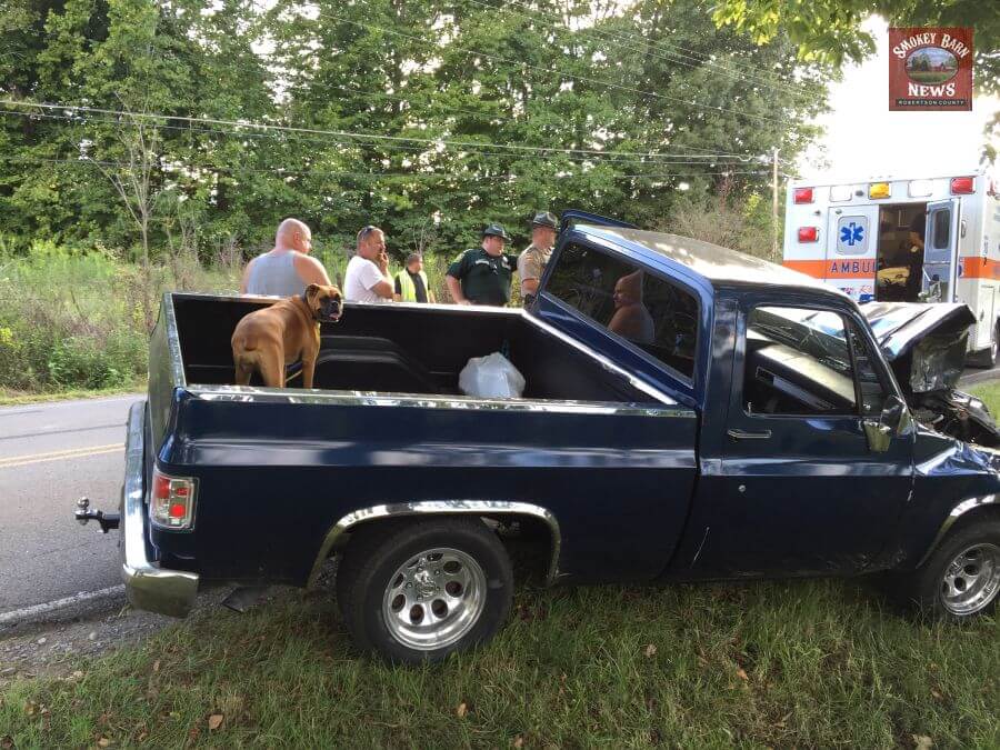 The driver of the pickup did suffer a head injury but was walking and talking to police after the wreck. The dog was also walking around after the wreck and seemed to be OK.