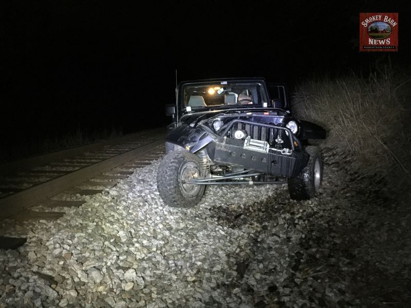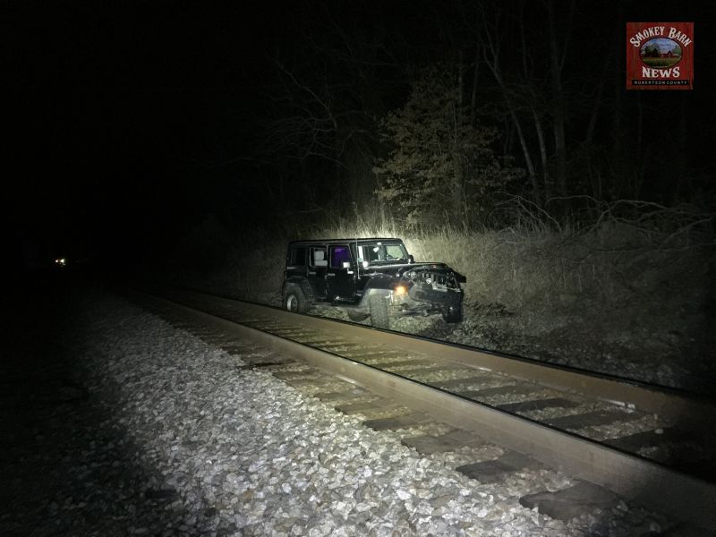 Officials tell Smokey Barn News that the train was moving slowly, about 25 miles per hour when the conductor spotted the vehicle on the tracks and hit the brakes. By the time the train and the Jeep collided the train was down to about 10 or 15 miles an hour and the driver was not injured.