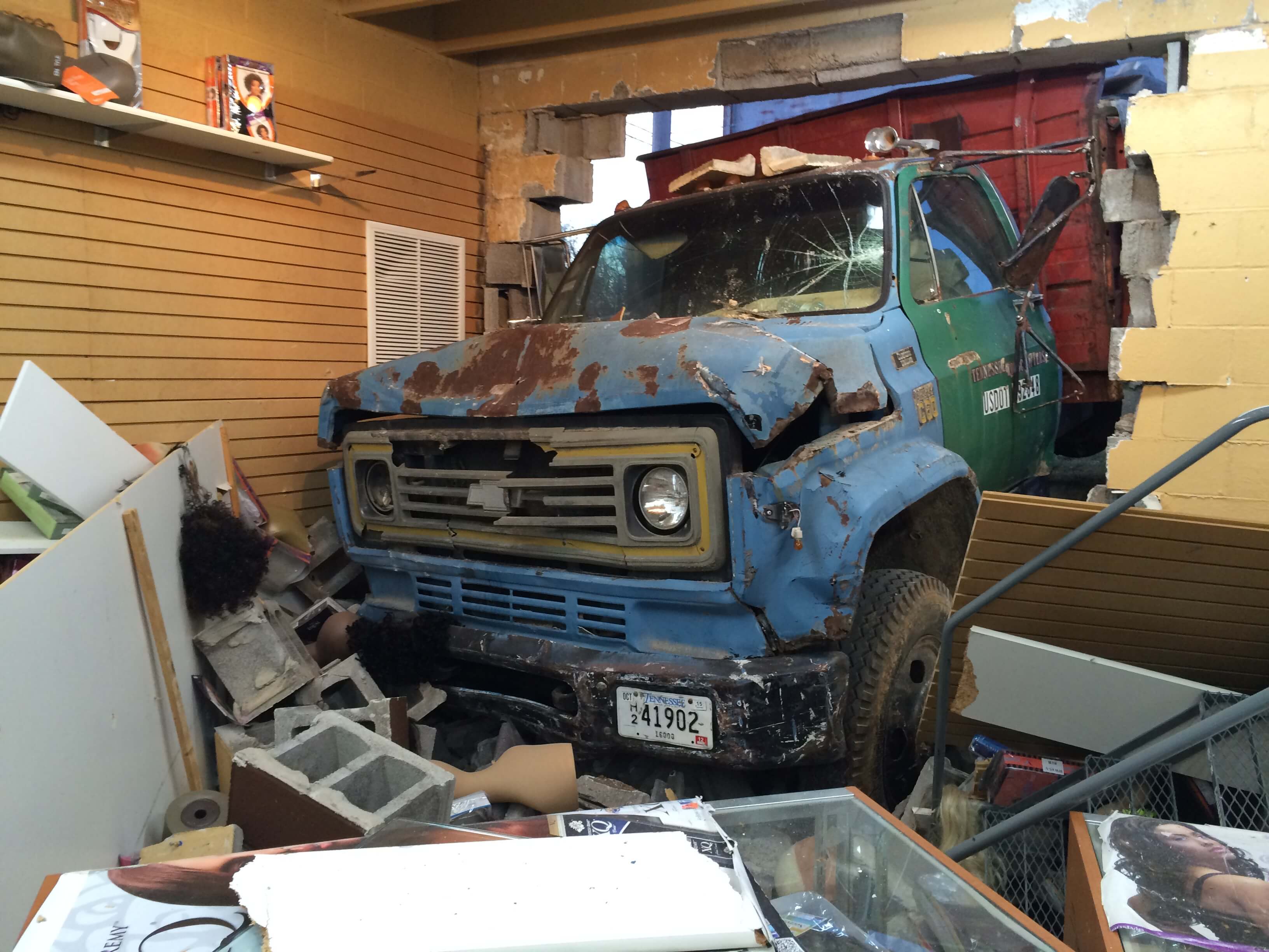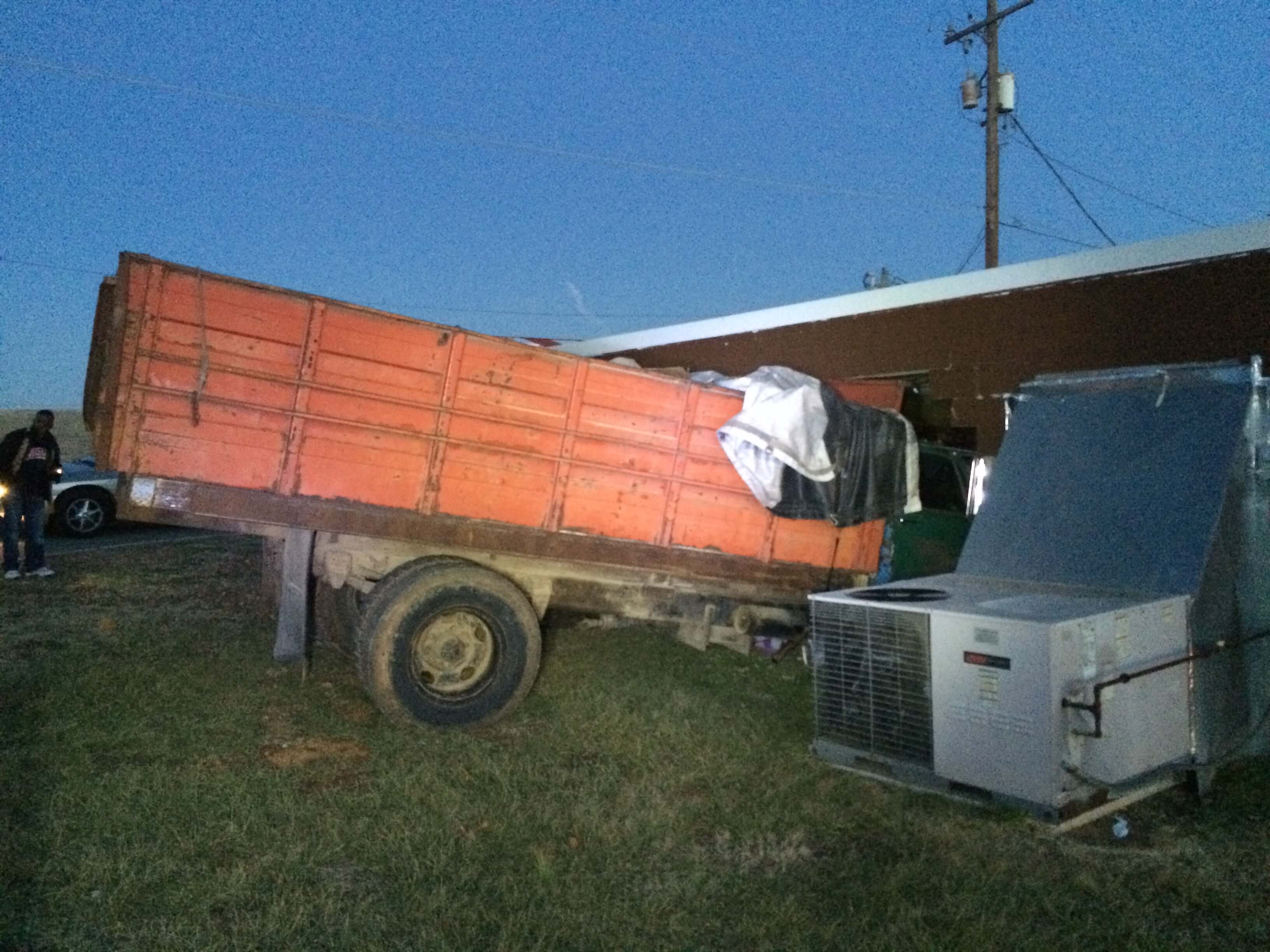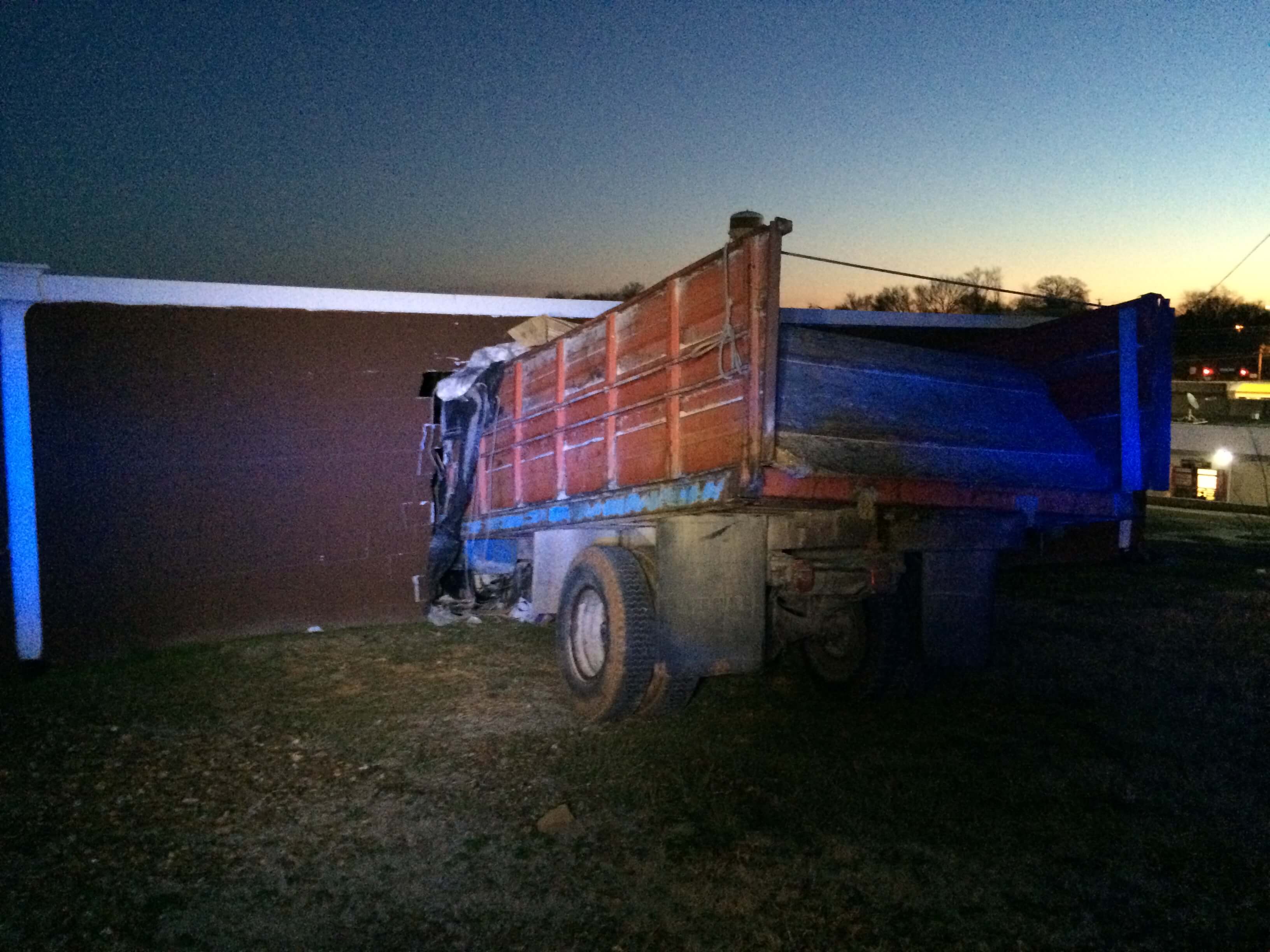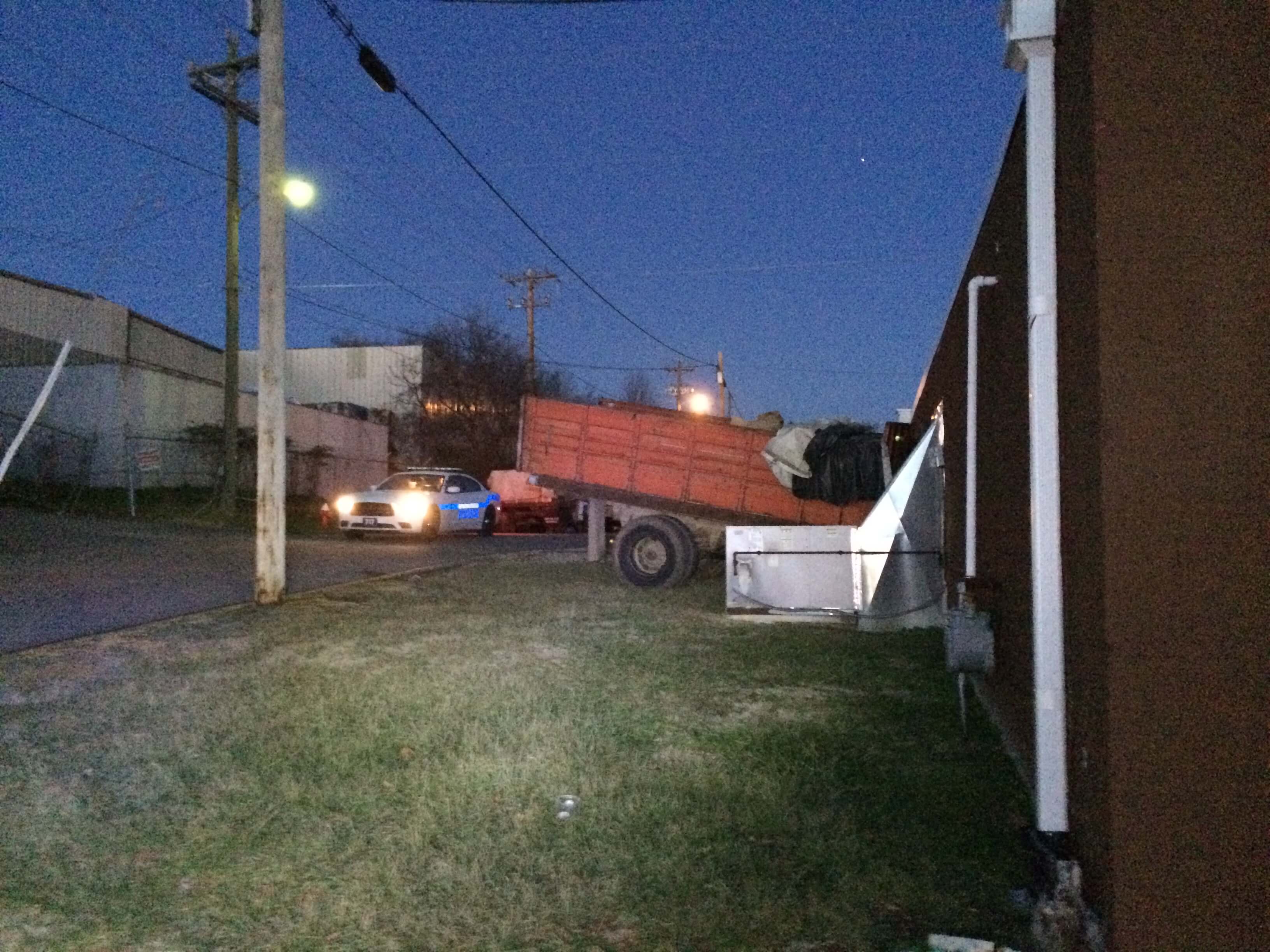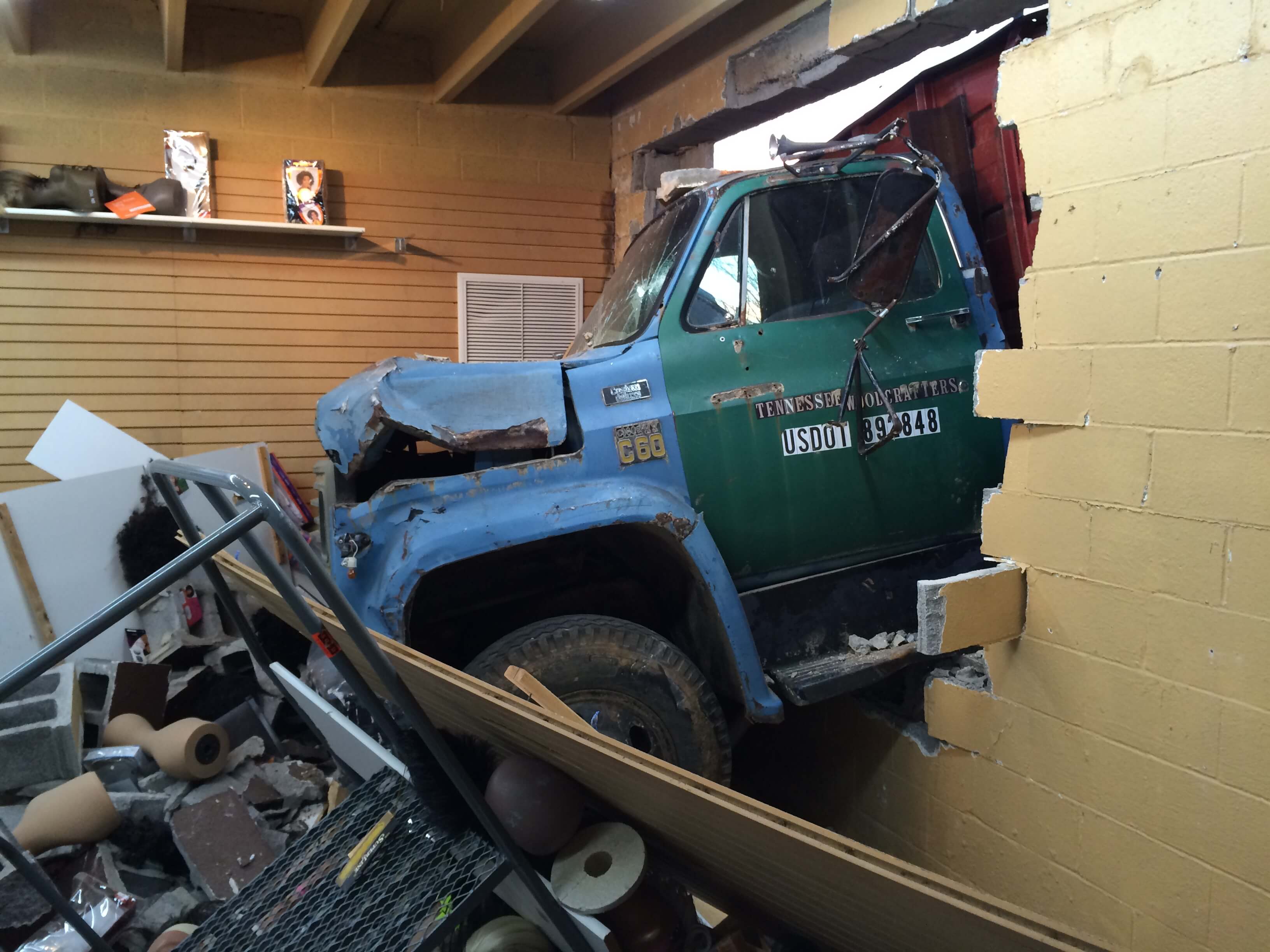 Police in Springfield are calling it possible vandalism. Sometime overnight (no one knows for sure exactly what time) a large industrial truck somehow broke lose from the parking lot of Tennessee Wood Crafters, sailed down a steep embankment and impaled itself into the back of Total Gospel Hair and Beauty Supply.