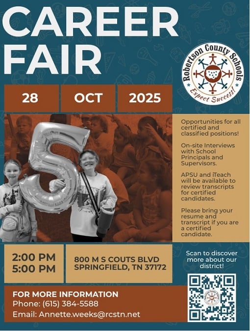 ROBERTSON COUNTY TENNESSEE: (Smokey Barn News) –Robertson County Schools will be holding its Fall Recruitment Fair on Tuesday, October 28, 2025, from 2:00 p.m. to 5:00 p.m. at the Robertson County Board of Education Central Office located at 800 M.S. Couts Blvd., in Springfield, TN. MAP
