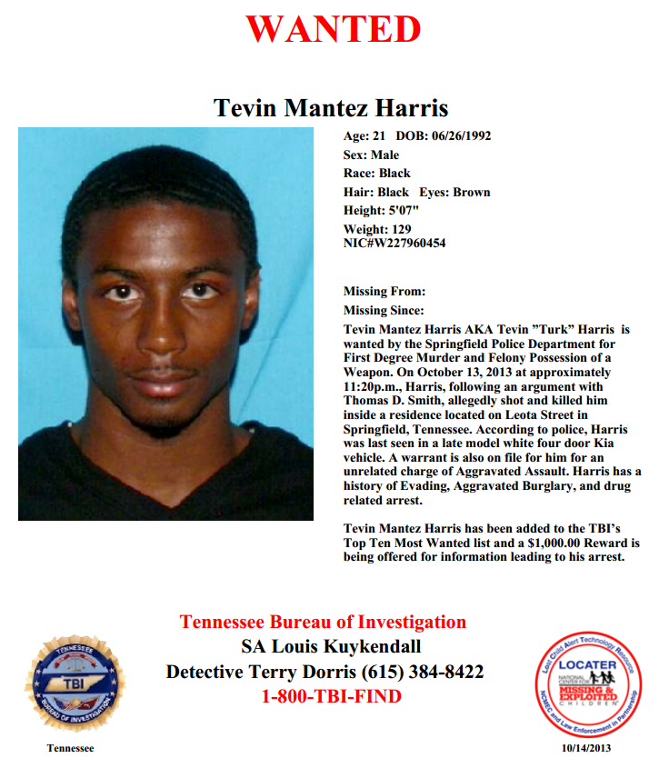 After Harris was named as a suspect, the search was on to find him. The TBI placed Harris on their Most Wanted list the next day.