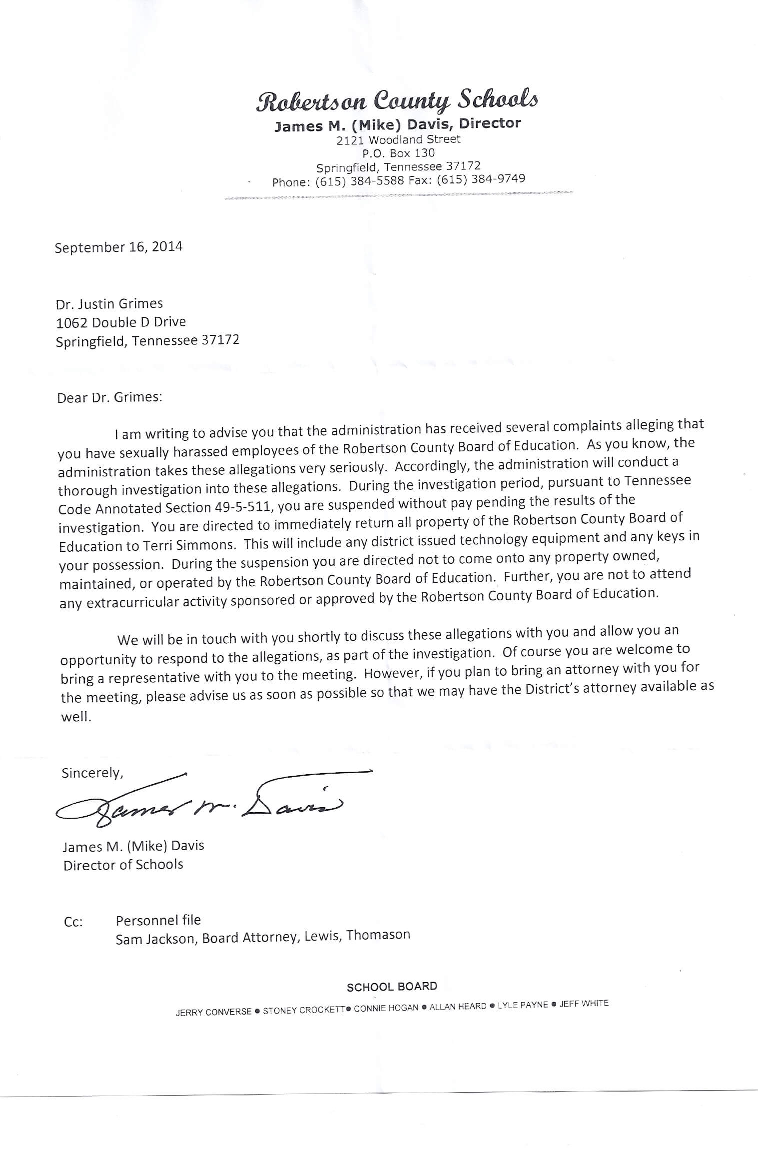 According to the letter Grimes received from the school board, the investigation was triggered after several complaints alleged that Dr Grimes sexually harassed employees of the Robertson County Board of Education.