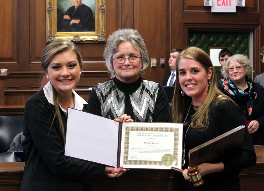 Springfield also brought home individual honors. Maddie Loving, a four-year Mock Trial veteran and senior at SHS earned two awards. For her superior performance as an attorney, Loving was named the 2014 Outstanding Defense Attorney for the district. “Because of the fact pattern, it was very difficult to put together the defense side of the case,” said Loving. “We put hours and hours of work into our presentation, and it felt great to win an award for that.”