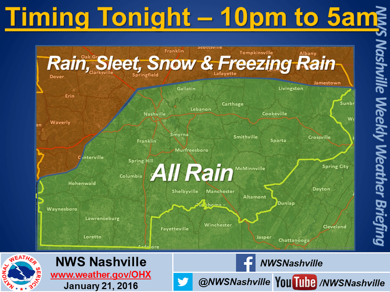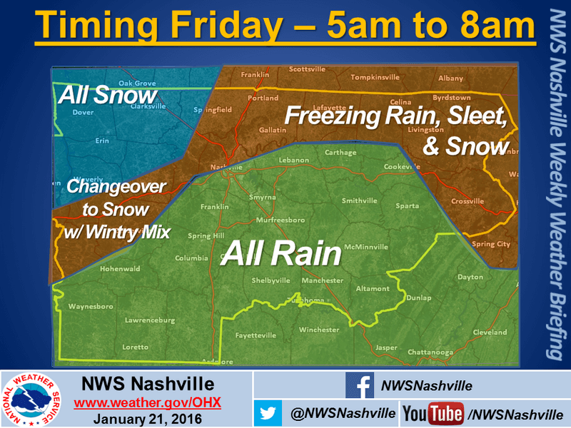 .A potent weather system will move into the region tonight offering up quite a bit of rain prior to midnight tonight. As we get into the early morning hours on Friday… Cold air supportive of wintry weather will begin to move into middle Tennessee. A transition from rain… To sleet and freezing rain… To snow will move across the mid-state throughout the day Friday. Counties north of interstate 40 near the Kentucky state line could see a coating of ice around daybreak Friday before the snow begins. A tenth of an inch is possible. Snow totals for the whole area will range from 3 to 6 inches in the far northwest… To 2 to 4 inches on the Cumberland plateau… To 2 to 3 inches elsewhere across middle Tennessee. Major travel impacts are expected Friday and could last into Saturday as temperatures will remain below freezing until Sunday afternoon.