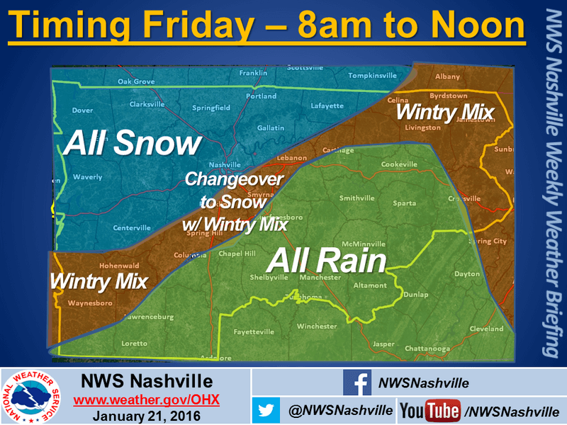 Timing: Snow falling around 6 a.m., CST, Friday in the northwest corner of Middle Tennessee, impacting Clarksville and Dover with rain along the Alabama border. Expect snow falling around 4 p.m., CST, on Friday and through the evening and overnight before tapering off Saturday.