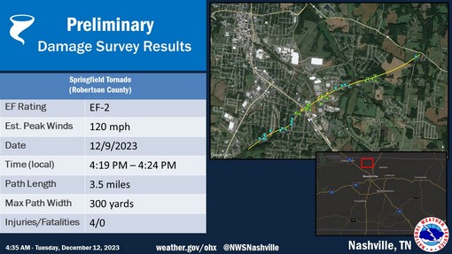 Following a damage survey,  US National Weather Service Nashville determined the tornado that struck Springfield in Robertson County was an EF-2 with a path length of 3.5 miles and max winds of 120 mph. 4 people were injured. See expandable tornado path map below.