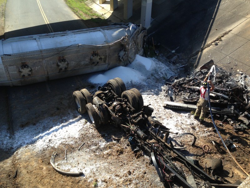 A tanker carrying silica pellets crashed through the railing on I-65 in Millersville Tuesday a little after 3pm. The rig continued through the meridian and hit a wall of dirt causing the rig to turn end over end and landed onto Williamson Rd below the interstate overpass near Slaters Creek. There was some damage to the bridge on the southbound side of I-65 and the southbound lanes will remain closed until a structural engineer arrives on the scene to access the damage before re-opening the overpass. Two individuals near by pulled the driver from the wreckage before it caught fire. The driver was lifeflighted to Vanderbilt. Injuries Unknown.