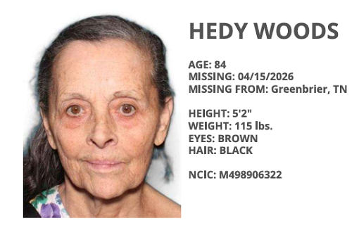 According to the Tennessee Bureau of Investigation, Hedy Woods was last seen on April 15, 2026, in the area of Gideon Road in Greenbrier, Tennessee.