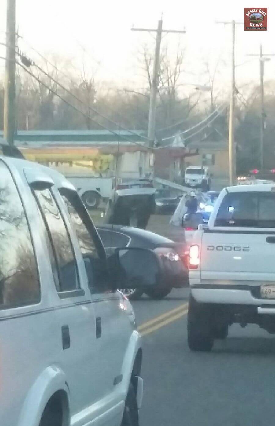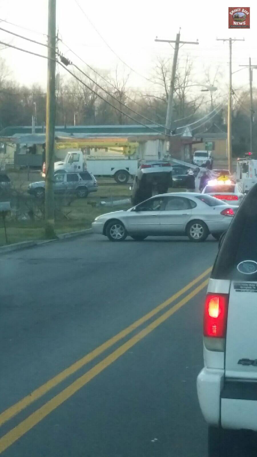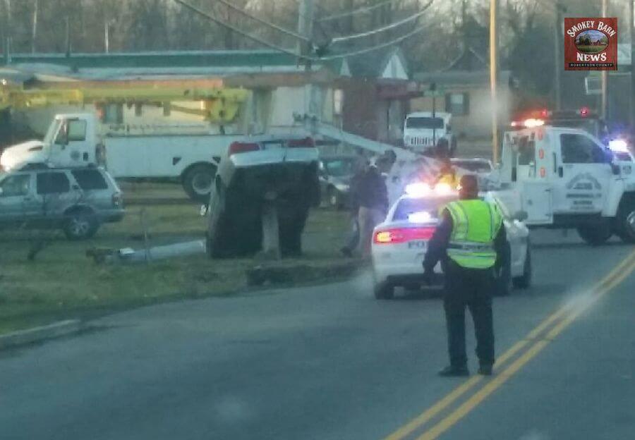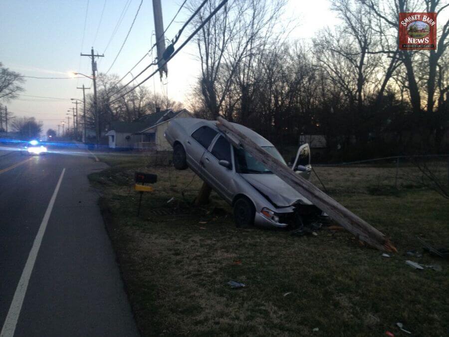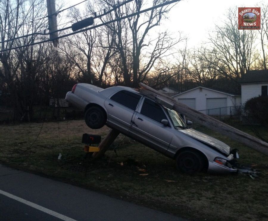 SPRINGFIELD TENNESSEE: (Smokey Barn News) – A vehicle became oddly impaled on a utility pole Friday morning after police say the driver fell asleep, left the roadway and crashed. Fortunately the driver was not injured and there was no one walking on the sidewalk near the crash.