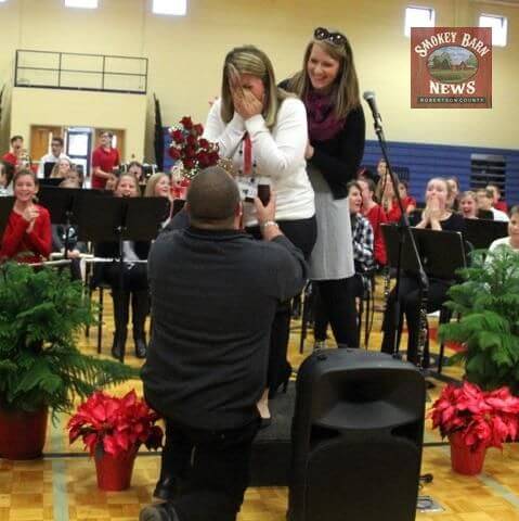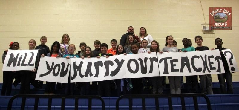After the concert Ashley was called up to the stage by principal Angie Frye, then Joseph came up and got down on one knee. One can assume that at this point Ashley knew something was up. Joseph then pointed to the children holding the sign that said “Will you marry my teacher.” (photo in slider below) Ashley saw the sign and smiled big, that’s when Joseph proposed.